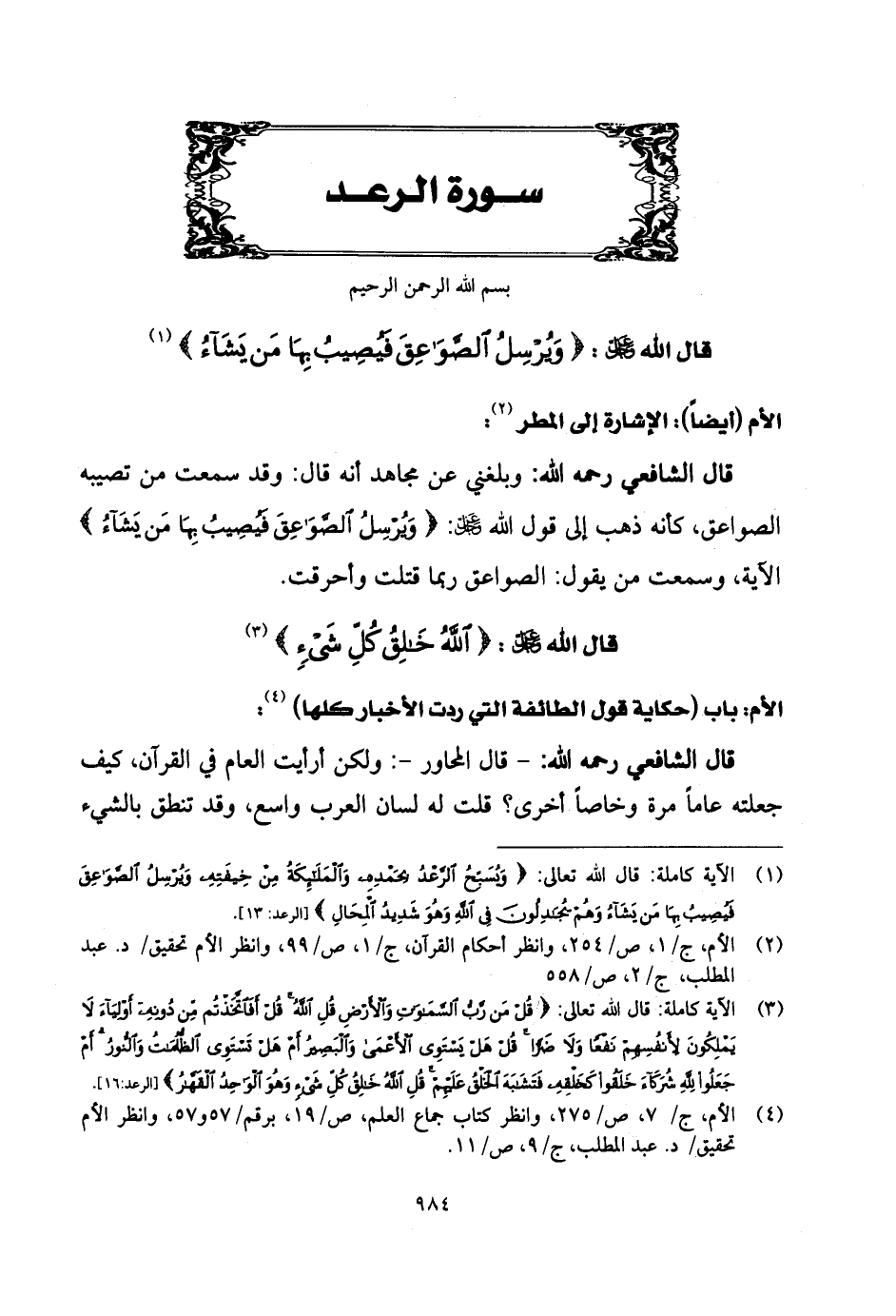 قال الشَّافِعِي رحمه الله: - قال المحاور -: ولكن أرأيت العام في القرآن، كيف جعلته عامًّا مرة وخاصاً أخرى؟
