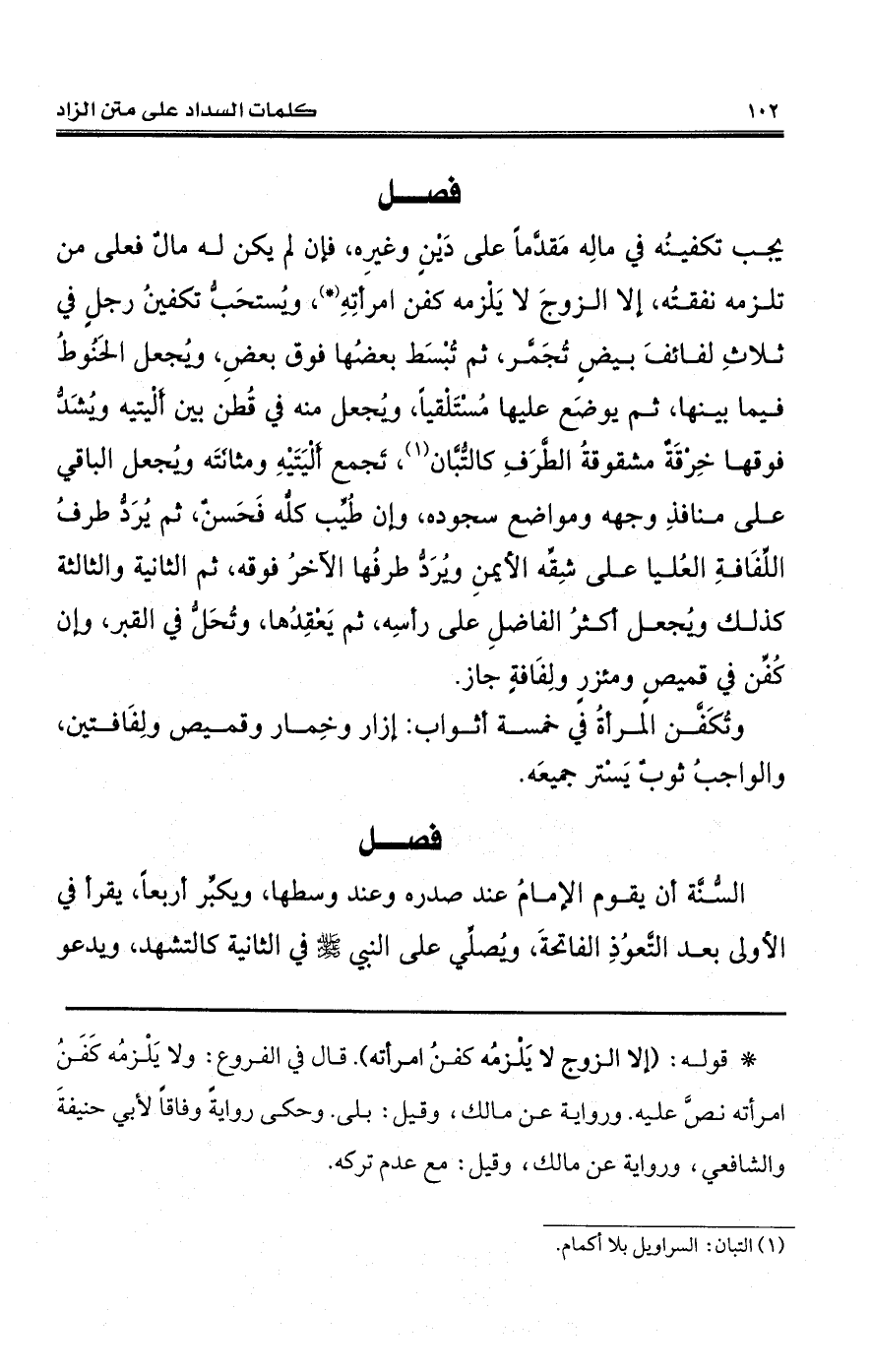 يجب تكفينُه في مالِه مَقدَّماً على دَيْنٍ وغيرِه، فإن لم يكن له مالٌ فعلى من تلزمه نفقتُه، إلا الزوجَ لا يَلْزمه كفن امرأتِهِ (*)، ويُستحَبُّ تكفينُ رجلٍ في ثلاثِ لفائفَ بيضٍ تُجَمَّر، ثم تُبْسَط بعضُها فوق بعضِ، ويُجعل الحَنُوطُ فيما بينها، ثم يوضَع عليها مُسْتَلْقياً، ويُجعل منه في قُطن بين أَلْيتيه ويُشَدُّ فوقها خِرْقَةٌ مشقوقةُ الطَّرَفِ كالتُّبَّان (¬1)، تَجمع أَلْيَتَيْهِ ومثانَتَه ويُجعل الباقي على منافذِ وجهه ومواضع سجوده، وإن طُيِّب كلُّه فَحَسنٌ، ثم يُرَدُّ طرفُ اللِّفَافةِ العُليا على شِقِّه الأيمنِ ويُرَدُّ طرفُها الآخرُ فوقه، ثم الثانية والثالثة كذلك ويُجعل أكثرُ الفاضلِ على رأسِه، ثم يَعْقِدُها، وتُحَلُّ في القبر، وإن كُفِّن في قميصٍ ومئزرٍ ولِفَافةٍ جاز.
