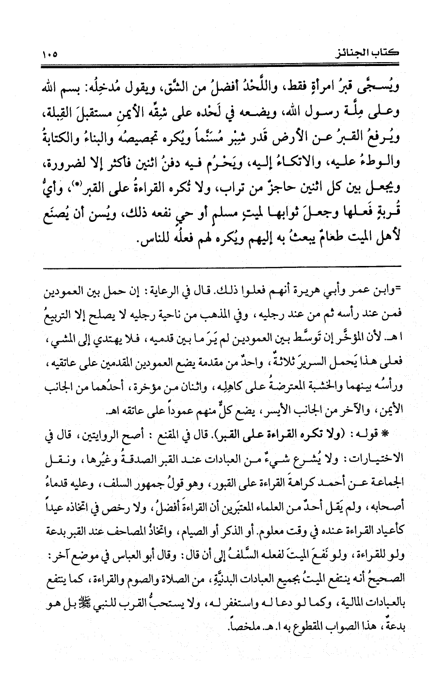 (*) قوله: (ولا تكره القراءة على القبر). قال في المقنع: أصح الروايتين، قال في الاختيارات: ولا يُشرع شيءٌ من العبادات عند القبر الصدقةُ وغيُرها، ونقل الجماعة عن أحمد كراهةَ القراءة على القبور، وهو قولُ جمهور السلف، وعليه قدماءُ أصحابه، ولم يَقل أحدٌ من العلماء المعتبَرين أن القراءةَ أفضلُ، ولا رخص في اتخاذه عيداً كأعياد القراءة عنده في وقت معلوم .. أو الذكر أو الصيام، واتخاذُ المصاحف عند القبر بدعة ولو للقراءة، ولو نَفعَ الميتَ لفعله السَّلفُ إلى أن قال: وقال أبو العباس في موضع آخر: الصحيحُ أنه ينتفع الميتُ بجميع العبادات البدنيَّةِ، من الصلاة والصوم والقراءة، كما ينتفع بالعبادات المالية، وكما لو دعا له واستغفر له، ولا يستحبُّ القرب للنبي - صلى الله عليه وسلم - بل هو بدعةٌ، هذا الصواب المقطوع به ا. هـ. ملخصاً.