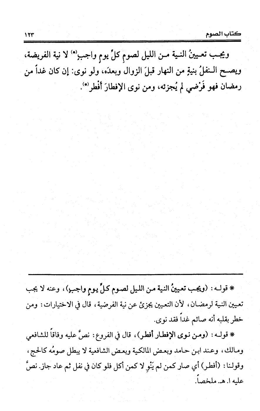 ويجب تعيينُ النية من الليل لصومِ كلِّ يومٍ واجبٍ (*) لا نية الفريضة، ويصح النفلُ بنيةٍ من النهار قبلَ الزوال وبعدَه، ولو نوى: إن كان غداً من رمضان فهو فَرْضي لم يُجزئه، ومن نوى الإفطارَ أَفْطر (*).