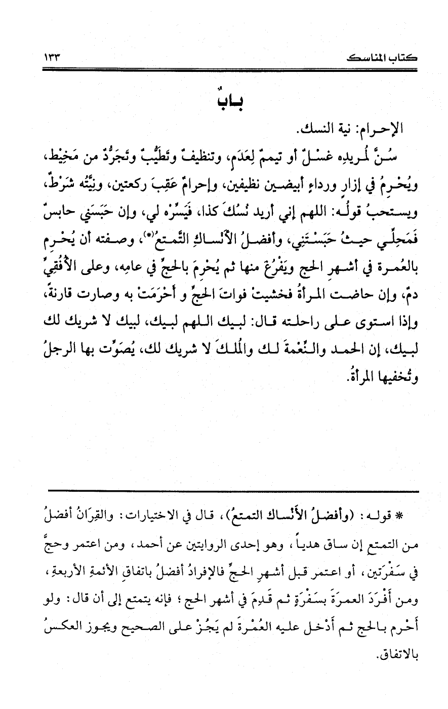 سُنَّ لمُريدِه غسْلٌ أو تيممٌ لِعَدَمٍ، وتنظيفٌ وتَطَيُّبٌ وتَجَرُّدٌ من مَخِيْط، ويُحْرِمُ في إزارٍ ورداءٍ أبيضين نظيفين، وإحرامٌ عَقِبَ ركعتين، ونِيَّتُه شَرْطٌ، ويستحبُ قولُه: اللهم إني أريد نُسُكَ كذا، فَيَسِّرْه لي، وإن حَبَسَني حابسٌ فَمَحِلِّي حيثُ حَبَسْتَنِي، وأفضلُ الأَنْساكِ التَّمتعُ (*)، وصفته أن يُحْرِم بالعُمرة في أشهرِ الحج ويَفْرُغَ منها ثم يُحْرِمَ بالحجِّ في عامِه، وعلى الأُفُقِيِّ دمٌ، وإن حاضت المرأةُ فخشيتْ فواتَ الحجِّ وأَحْرَمَتْ به وصارت قارنةً، وإذا استوى على راحلته قال: لبيك اللهم لبيك، لبيك لا شريك لك لبيك، إن الحمد والنِّعْمةَ لك والمُلكَ لا شريك لك، يُصَوِّت بها الرجلُ وتُخفيها المرأةُ.