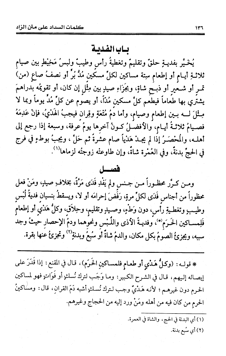 يُخَيَّر بفديةٍ حلقٌ وتقليمٌ وتغطيةُ رأسٍ وطيبٌ ولبسُ مَخِيْطٍ بين صيامِ ثلاثةِ أيامٍ أو إطعامِ سِتة مساكين لكلِّ مسكينٍ مُدُّ بُرٍّ أو نصفُ أو شعيرٍ أو ذبحِ شاةٍ، وبجَزَاءِ صيدٍ بين مِثْلٍ إن كان، أو تقويمُه بدراهمَ يشتري بها طعاماً فيطعم كلَّ مسكينٍ مُدّاً، أو يصوم عن كلِّ مُدٍّ يوماً وبما لا مِثْلَ له بين إطعامٍ وصيامٍ، وأما دمُ مُتْعَةٍ وقِرانٍ فيجبُ الهَدْيُ، فإنْ عَدِمَهُ فصيامُ ثلاثةُ أيامٍ، والأفضلُ كونُ آخرِها يومُ عرفة، وسبعة إذا رجع إلى أهله، والمُحْصَرُ إذا لم يجدْ هَدْياً صام عشرةً ثم حَلَّ، ويجبُ بوطءٍ في فرج يُغْنِي الحجِّ بدنةٌ، وفي العُمْرة شاةٌ، وإن طاوعتْه زوجتُه لزماها (¬1).