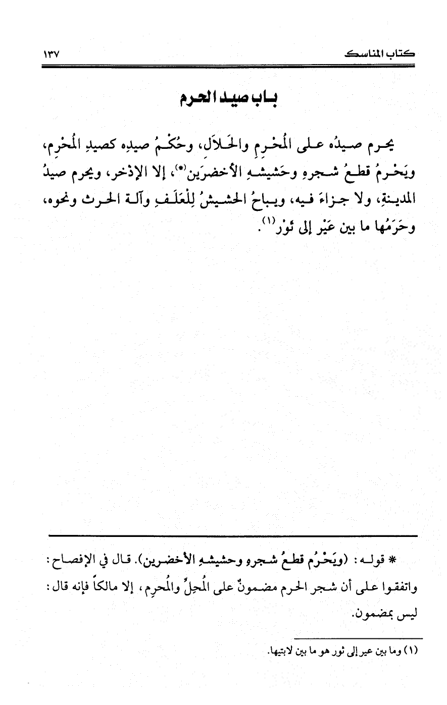 يحرم صيدُه على المُحْرِمِ والحَلاَلِ، وحُكْمُ صيدِه كصيدِ المُحْرِم، ويَحْرمُ قطعُ شجرهِ وحَشيشهِ الأخضرَين (*)، إلا الإذْخر، ويحرم صيدُ المدينةِ، ولا جزاءَ فيه، ويباحُ الحشيشُ لِلْعَلَفِ وآلة الحرث ونحوه، وحَرَمُها ما بين عَيْر إلى ثَوْر (¬1).