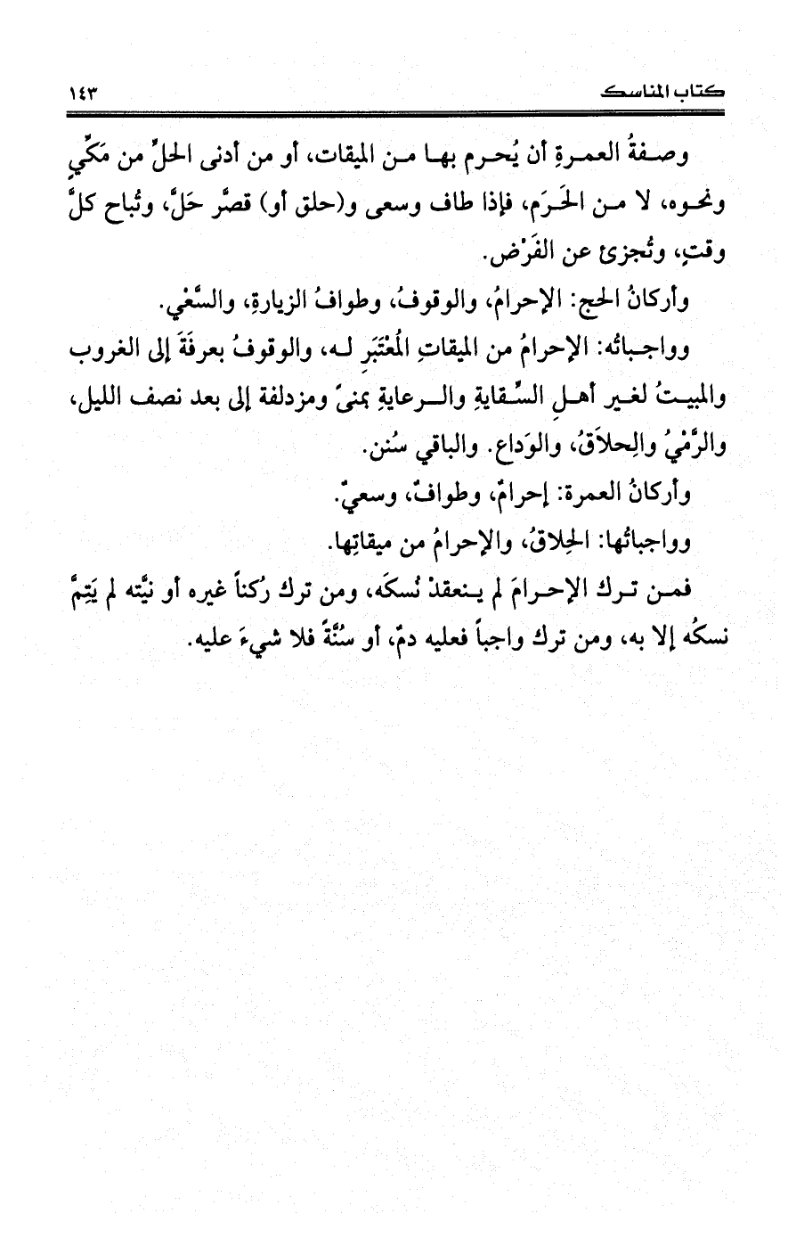 فمن ترك الإحرامَ لم ينعقدْ نُسكَه، ومن ترك رُكناً غيره أو نيَّته لم يَتِمَّ نسكُه إلا به، ومن ترك واجبًا فعليه دمٌ، أو سُنَّةً فلا شيءَ عليه.