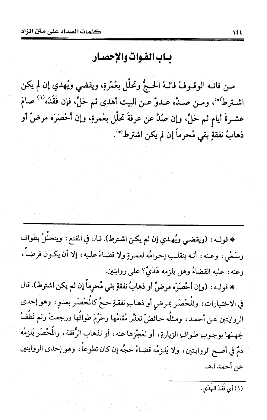 من فاته الوقوفُ فاتَهُ الحجُّ وتحلَّل بعُمْرةٍ، ويقضي وُيهدي إن لم يكن اشترطَ (*)، ومن صدَّه عدوٌ عن البيت أهدى ثم حَلَّ، فإن فَقَدَه (¬1) صامَ عشرةَ أيامٍ ثم حَلَّ، وإن صُدَّ عن عرفةَ تحلَّل بعُمرةٍ، وإن أَحْصَرَه مرضٌ أو ذهابُ نفقةٍ بقي مُحرماً إن لم يكن اشترط (*).