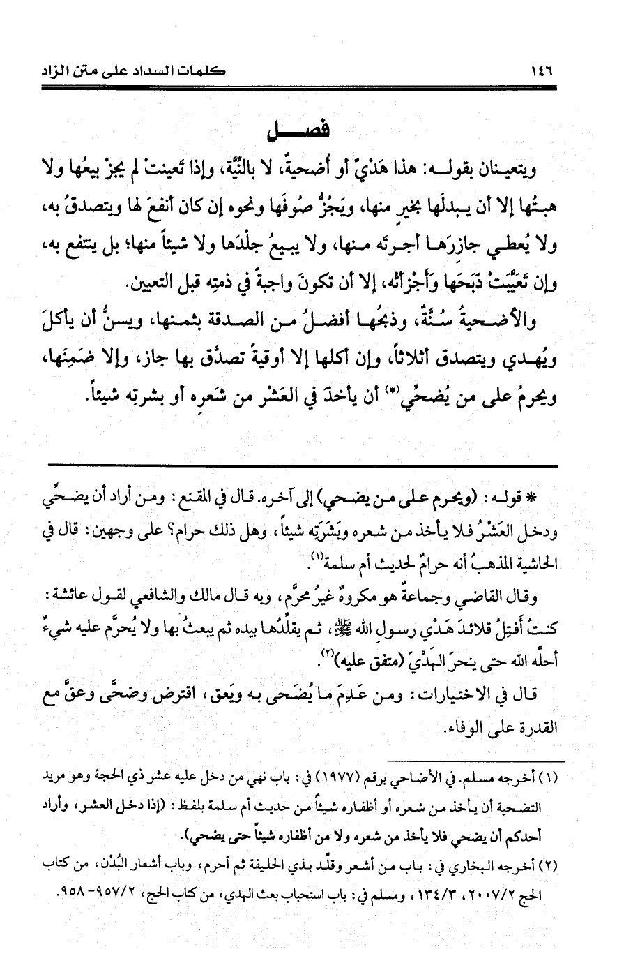 والأضحيةُ سُنَّةٌ، وذبحُها أفضلُ من الصدقة بثمنها، ويسنُّ أن يأكلَ ويُهدي ويتصدق أثلاثاً، وإن أكلها إلا أوقيةً تصدَّق بها جاز، وإلا ضمنها ويحرمُ على من يُضحِّي (*) أن يأخذَ في العَشْر من شَعرِه أو بشرتِه شيئاً.