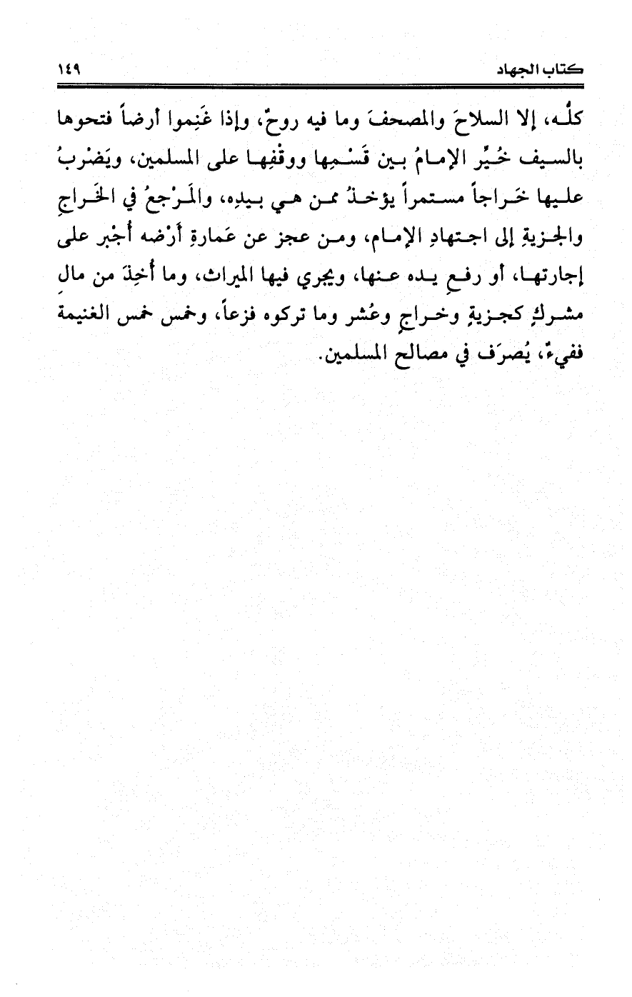 كلُّه، إلا السلاحَ والمصحفَ وما فيه روحٌ، وإذا غَنِموا أرضاً فتحوها بالسيف خُيِّر الإمامُ بين قَسْمِها ووقْفِها على المسلمين، ويَضْربُ عليها خَراجاً مستمراً يؤخذُ ممن هي بيدِه، والمَرْجعُ في الخَراجِ والجزيةِ إلى اجتهادِ الإمام، ومن عجز عن عَمارةِ أَرْضه أُجْبر على إجارتها، أو رفعِ يده عنها، ويجري فيها الميراث، وما من مالِ مشركٍ كجزيةٍ وخراجٍ وعُشر وما تركوه فزعاً، وخمس خمس الغنيمة ففيءٌ، يُصرَف في مصالح المسلمين.