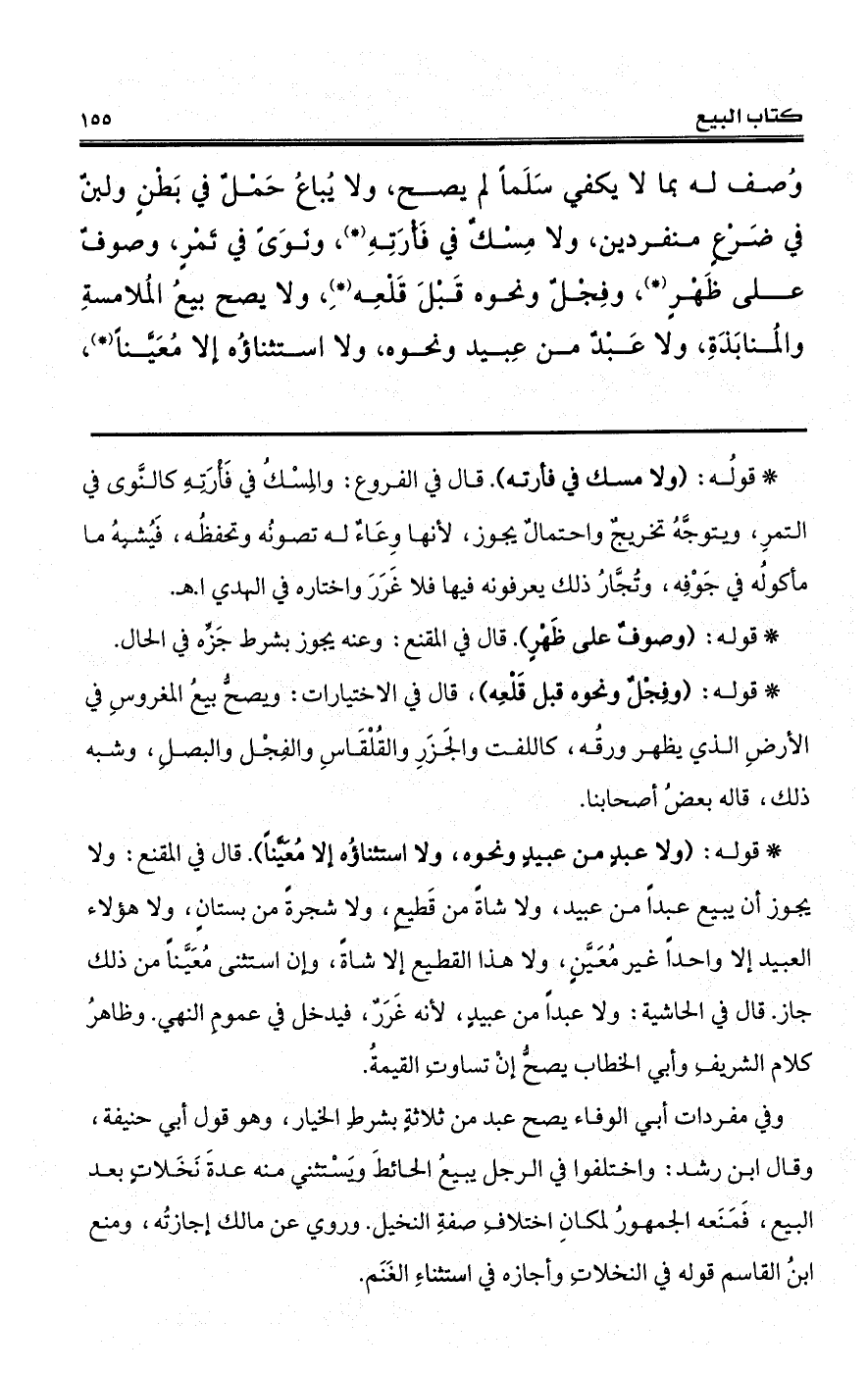 (*) قوله: (ولا عبدٍ من عبيدٍ ونحوه، ولا استثناؤُه إلا مُعَيَّناً). قال في المقنع: من عبيد، ولا شاةً من قَطيعٍ، ولا شجرةً من بستانٍ، ولا هؤلاء العبيد إلا واحداً غير مُعَيَّنٍ، ولا هذا القطيع إلا شاةً، وإن استثنى مُعَيَّناً من ذلك جاز. قال في الحاشية: ولا عبداً من عبيدٍ، لأنه غَرَرٌ، فيدخل في عمومِ النهي. وظاهرُ كلام الشريفِ وأبي الخطاب يصحُّ إنْ تساوتِ القيمةُ.