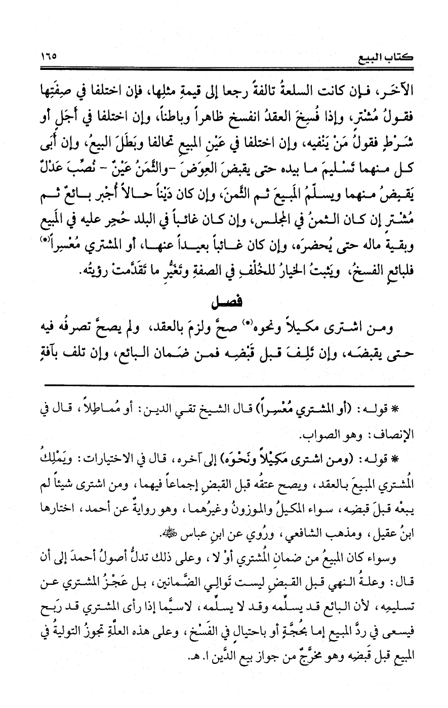 (*) قوله: (ومن اشترى مَكِيْلاً ونَحْوَه) إلى آخره، قال في الاختيارات: ويَمْلِكُ المُشتري المبيعَ بالعقد، ويصح عتقُه قبل القبضِ إجماعاً فيهما، ومن اشترى شيئاً لم يبعْه قبلَ قبضِه، سواء المكيلُ والموزونُ وغيرُهما، وهو روايةٌ عن أحمد، اختارها ابنُ عقيل، ومذهب الشافعي، ورُوي عن ابنِ عباس - رضي الله عنه -.