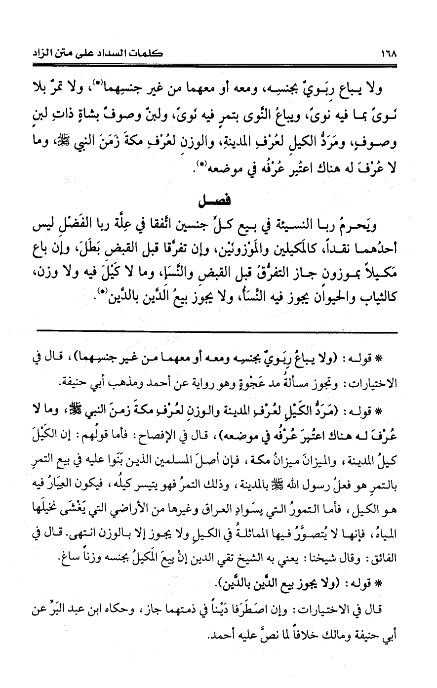 (*) قوله: (مَرَدُّ الكَيْلِ لعُرْفِ المدينة والوزنِ لعُرْفِ مكةَ زمنَ النبي - صلى الله عليه وسلم -، وما لا عُرْفَ له هناك اعتُبِرَ عُرْفُه في موضعه)، قال في الإفصاح: فأما قولُهم: إن الكَيْلَ كيلُ المدينة، والميزانَ ميزانُ مكة، فإن أصلَ المسلمين الذين بَنَوا عليه في بيعِ التمرِ بالتمرِ هو فعلُ رسول الله - صلى الله عليه وسلم - بالمدينة، وذلك التمرُ فهو يتيسر كيلُه، فيكون العِيَارُ فيه هو الكيل، فأما التمورُ التي بِسَوادِ العراق وغيرها من الأراضي التي يَغْشَى نخيلَها المياهُ، فإنها لا يُتصوَّرُ فيها المماثلةُ في الكيلِ ولا يجوز إلا بالوزن انتهى. قال في الفائق: وقال شيخنا: يعني به الشيخ تقي الدين إنْ بِيعَ المَكيلُ بجنسه وزنًا ساغ.
