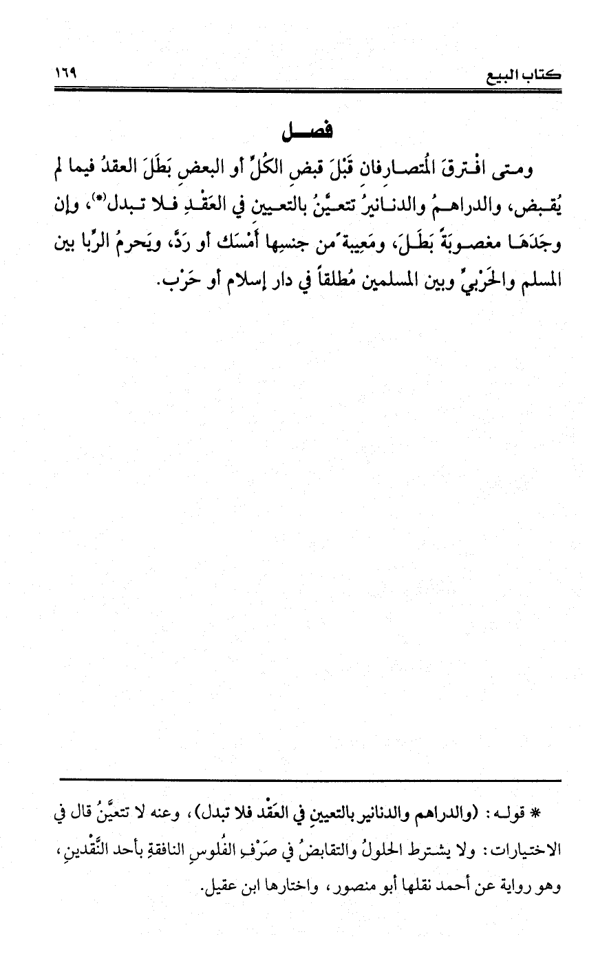 ومتى افْترقَ المُتصارِفانِ قَبْلَ قبضِ الكُلِّ أو البعضِ بَطَلَ العقدُ فيما لم يُقبض، والدراهمُ والدنانيرُ تتعيَّنُ بالتعيينِ في العَقْدِ فلا تبدل (*)، وإن وجَدَهَا مغصوبَةً بَطَلَ، ومَعِيبةً من جنسِها أَمْسَك أو رَدَّ، ويَحرمُ الرِّبا بين المسلم والحَرْبيِّ وبين المسلمين مُطلقاً في دار إسلام أو حَرْب.