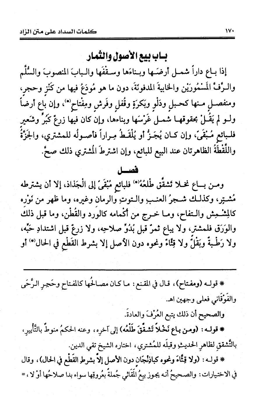 ومن باع نخلا تَشقَّق طْلعُهُ (*) فلبائعٍ مُبْقَىً إلى الْجَذاذ، إلا أن يشترطه مُشترٍ، وكذلك شجرُ العنبِ والتوتِ والرمانِ وغيره، وما ظهر من نَوْرِه كالمِشْمِش والتفاح، وما خرج من أَكْمامه كالورد والقُطْن، وما قبل ذلك والوَرَق فلمشترٍ، ولا يباع ثمرٌ قبل بُدُوِّ صلاحِه، ولا زرعٌ قبل اشتدادِ حَبِّه، ولا رَطْبةٌ وبَقْلٌ ولا قِثَّاءٌ ونحوه دون الأصل إلا بشرط القَطْعِ في الحال (*) أو