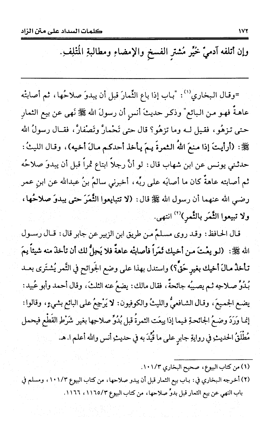 (¬2) أخرجه البخاري في: باب بيع الثمار قبل أن يبدو صلاحها، من كتاب البيوع في باب النهي عن بيع الثمار قبل بدوِّ صلاحها، من كتاب البيوع 3/ 1165، 1166.