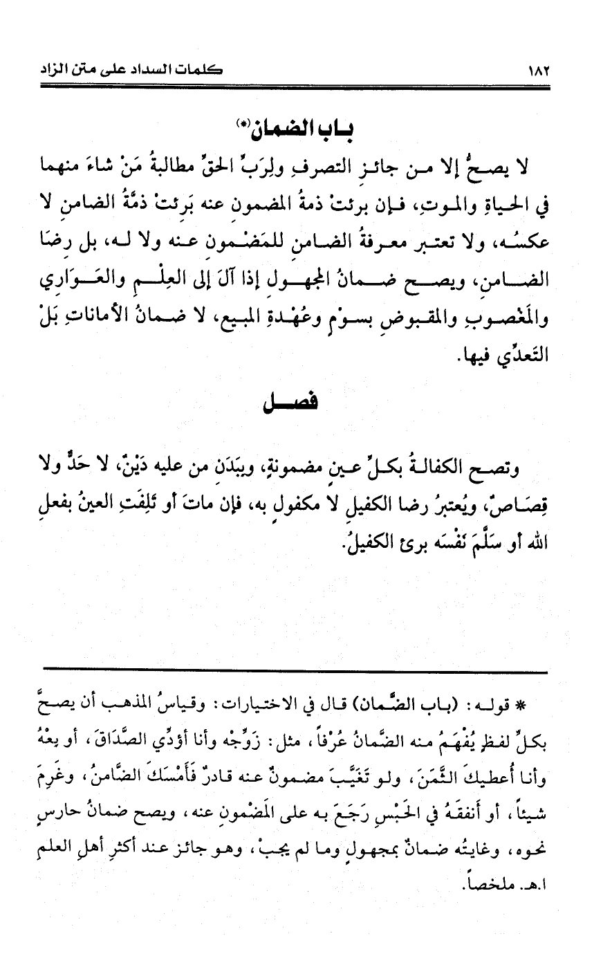 لا يصحُّ إلا من جائزِ التصرفِ ولِرَبِّ الحقِّ مطالبةُ مَنْ شاءَ منهما في الحياةِ والموتِ، فإن برئتْ ذمةُ المضمونِ عنه بَرِئتْ ذمَّةُ الضامن لا عكسُه، ولا تعتبر معرفةُ الضامنِ للمَضْمونِ عنه ولا له، بل رِضَا الضامنِ، ويصح ضمانُ المجهولِ إذا آلَ إلى العِلْمِ والعَوَارِي والمَغْصوبِ والمقبوضِ بسوْمٍ وعُهْدةِ المبيع، لا ضمانُ الأماناتِ بَلْ التَعدِّي فيها.