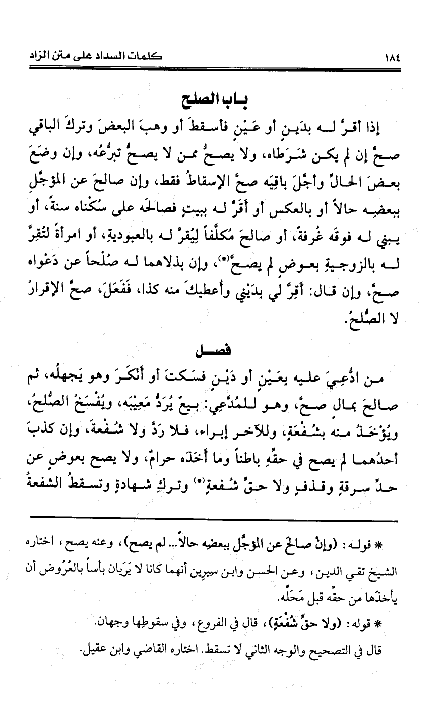 من ادُّعِيَ عليه بِعَيْنٍ أو دَيْنٍ فسَكتَ أو أَنْكَرَ وهو يَجهلُه، ثم صالحَ بمالٍ صحَّ، وهو للمُدَّعِي: بيعٌ يُرَدُّ مَعِيْبَه، ويُفْسَخُ الصُّلحُ، ويُؤْخَذُ منه بشُفْعَةٍ، وللآخر إبراء، فلا رَدَّ ولا شُفْعةَ، وإن كذبَ أحدُهما لم يصح في حقِّهِ باطناً وما أَخَذَه حرامٌ، ولا يصح بعوضٍ عن حدِّ سرقةٍ وقذفٍ ولا حقِّ شُفعةٍ (*) وتركِ شهادةٍ وتسقطُ الشفعةُ