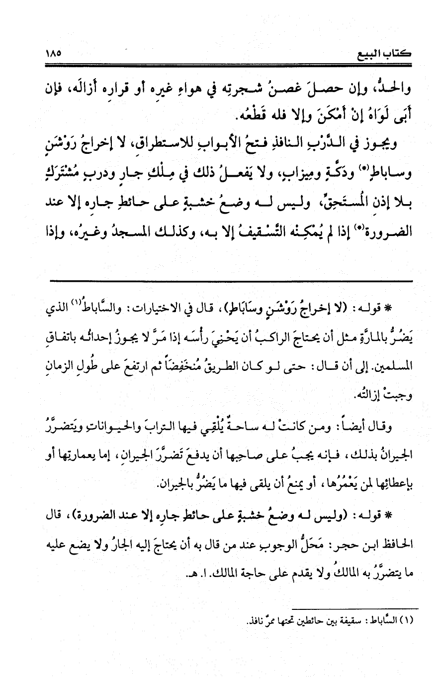 (*) قوله: (لا إخراجُ رَوْشَنٍ وسَابَاطٍ)، قال في الاختيارات: والسَّاباطُ (¬1) الذي يَضُرُّ بالمارَّةِ مثل أن يحتاجَ الراكبُ أن يَحْنِيَ رأْسَه إذا مَرَّ لا يجوزُ إحداثُه باتفاقِ المسلمين. إلى أن قال: حتى لو كان الطريقُ مُنخَفِضَاً ثم ارتفعَ على طُولِ الزمانِ وجبتْ إزالتُه.