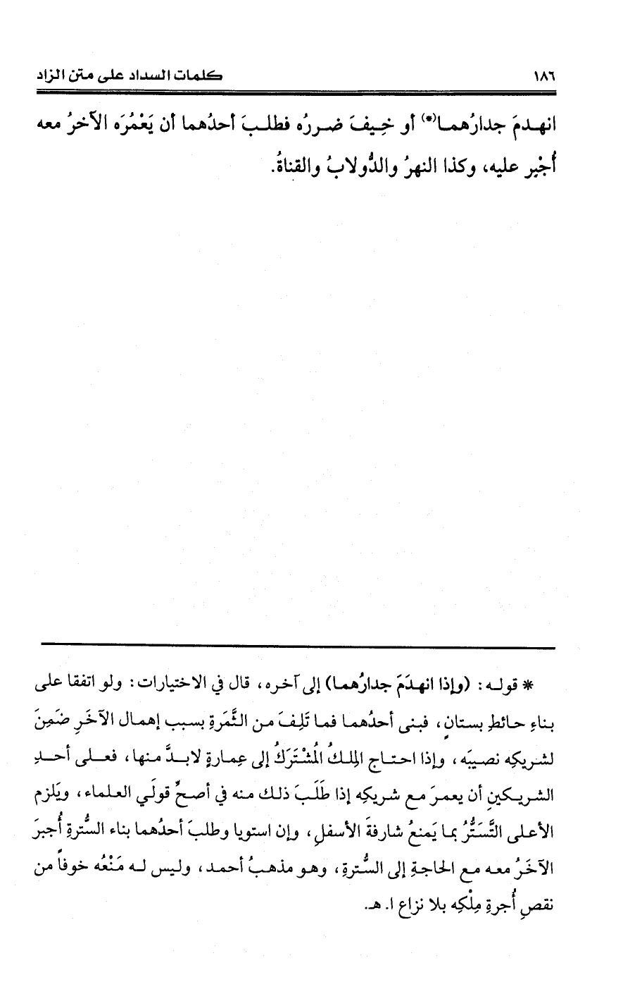 انهدمَ جدارُهما (*)، أو خيف ضررُه فطلبَ أحدُهما أن يَعْمُرَه الآخرُ معه أُجْبِر عليه، وكذا النهرُ والدُّولابُ والقناةُ.