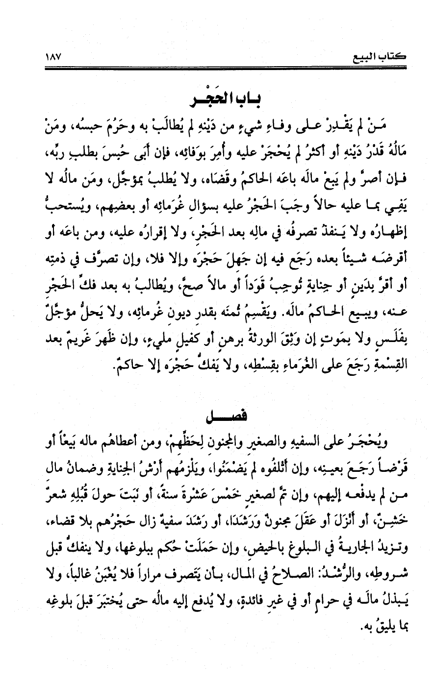 مَنْ لم يقدر على وفاءِ شيءٍ من دَيْنهِ لم يُطالَبْ به وحَرُمَ حبسُه، ومَنْ مَالُهُ قَدْرُ دَيْنهِ أو أكثرُ لم يُحْجَرْ عليه وأُمِرَ بوَفائِه، فإن أَبَى حُبِسَ بطلبِ ربِّه، فإن أصرَّ ولم يَبعْ مالَه باعَه ولا يُطلبُ بمؤجَّل، ومَن مالُه لا يَفِي بما عليه حالاً عليه بسؤالِ غُرَمائِه أو بعضِهم، ويُستحبُّ إظهارُه ولا يَنفذُ ولا إقرارُه عليه، ومن باعَه أو أقرضَه شيئاً بعده رَجَع فيه إن جَهِلَ حَجْرَه وإلا فلا، وإن أو أقرَّ بِدَينٍ أو جِنايةٍ تُوجِبُ قَوَداً أو مالاً صحَّ، ويُطالبُ به بعد فكِّ الحَجْرِ عنه، ويبيع الحاكمُ مالَه. ويَقْسِمُ ثُمنَه بقدرِ ديونِ غُرمائِه، ولا يَحلُّ مؤجَّلٌ بِفَلَسٍ ولا بِمَوتٍ إن وَثِقَ الورثةُ برهنٍ أو كفيلٍ مليءٍ، وإن ظَهرَ غَريمٌ بعد القِسْمةِ رَجَعَ على الغُرَماءِ بقِسْطِه، ولا يَفكُّ حَجْرَه إلا حاكمٌ.