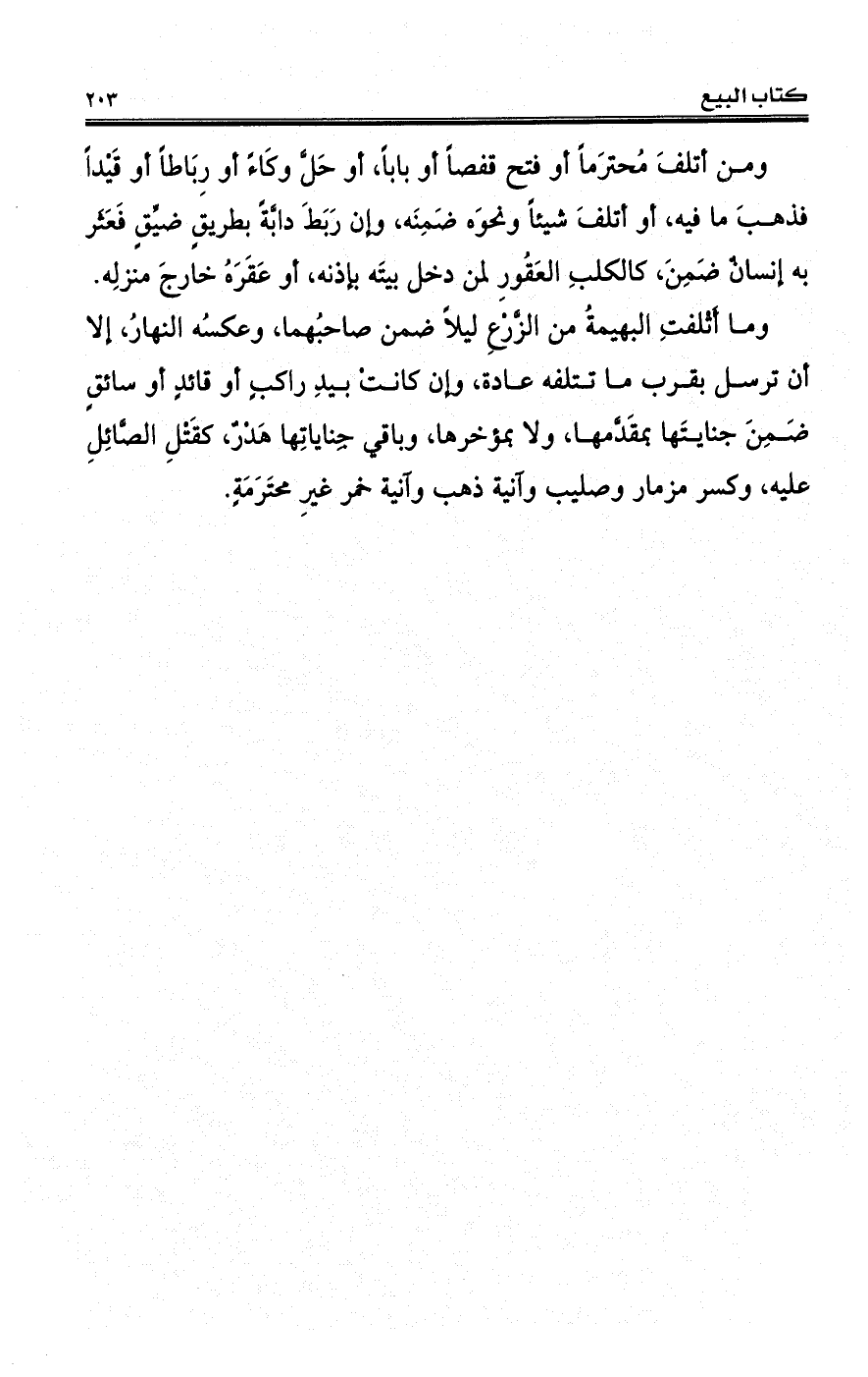 وما أَتْلفتِ البهيمةُ من الزَّرْعِ ليلاً ضمن صاحبُهما، وعكسُه النهارُ، إلا أن ترسل بقرب ما تتلفه عادة، وإن كانتْ بيدِ راكبٍ أو قائدٍ أو سائقٍ ضَمِنَ جنايتَها بمقَدَّمها، ولا بمؤخرها، وباقي جِناياتِها هَدْرٌ، كقَتْلِ الصَّائِلِ عليه، وكسر مزمار وصليب وآنية ذهب وآنية خمر غيرِ محتَرَمَةٍ.