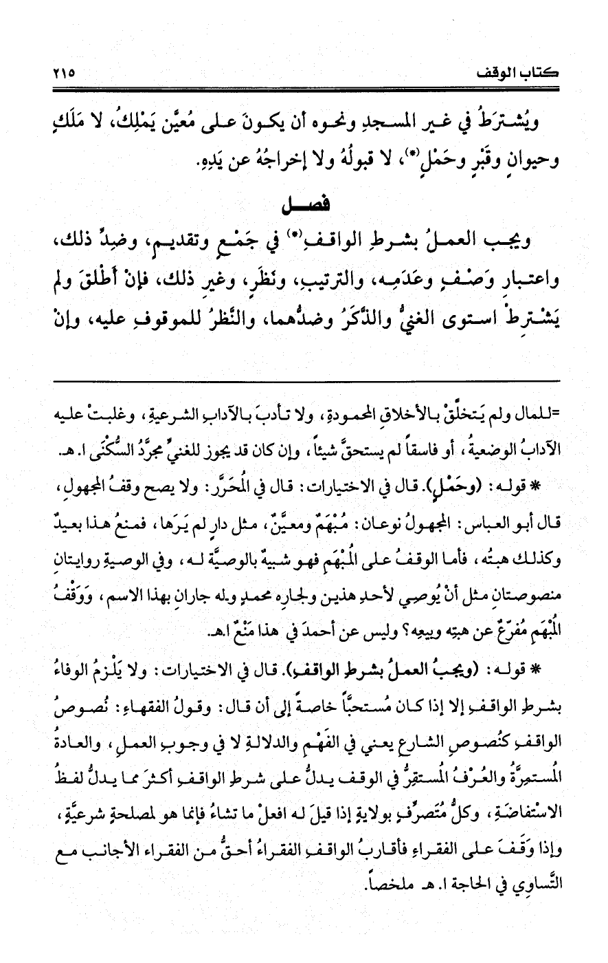 (*) قوله: (وحَمْلٍ). قال في الاختيارات: قال في المُحَرَّر: ولا يصح وقفُ المجهولِ، قال أبو العباس: المجهولُ نوعان: مُبْهَمٌ ومعيَّنٌ، مثل دارٍ لم يَرَها، فمنعُ هذا بعيدٌ وكذلك هبتُه، فأما الوقفُ على المُبْهَمِ فهو شبيهٌ بالوصيَّة له، وفي الوصيةِ روايتانِ منصوصتانِ مثل أنْ يُوصِي لأحدِ هذين ولجارِه محمدٍ وله جارانِ بهذا الاسم، وَوَقْفُ المُبْهَمِ مُفرّعٌ عن هبتِه وبيعِه؟ وليس عن أحمدَ في هذا مَنْعٌ ا. هـ.