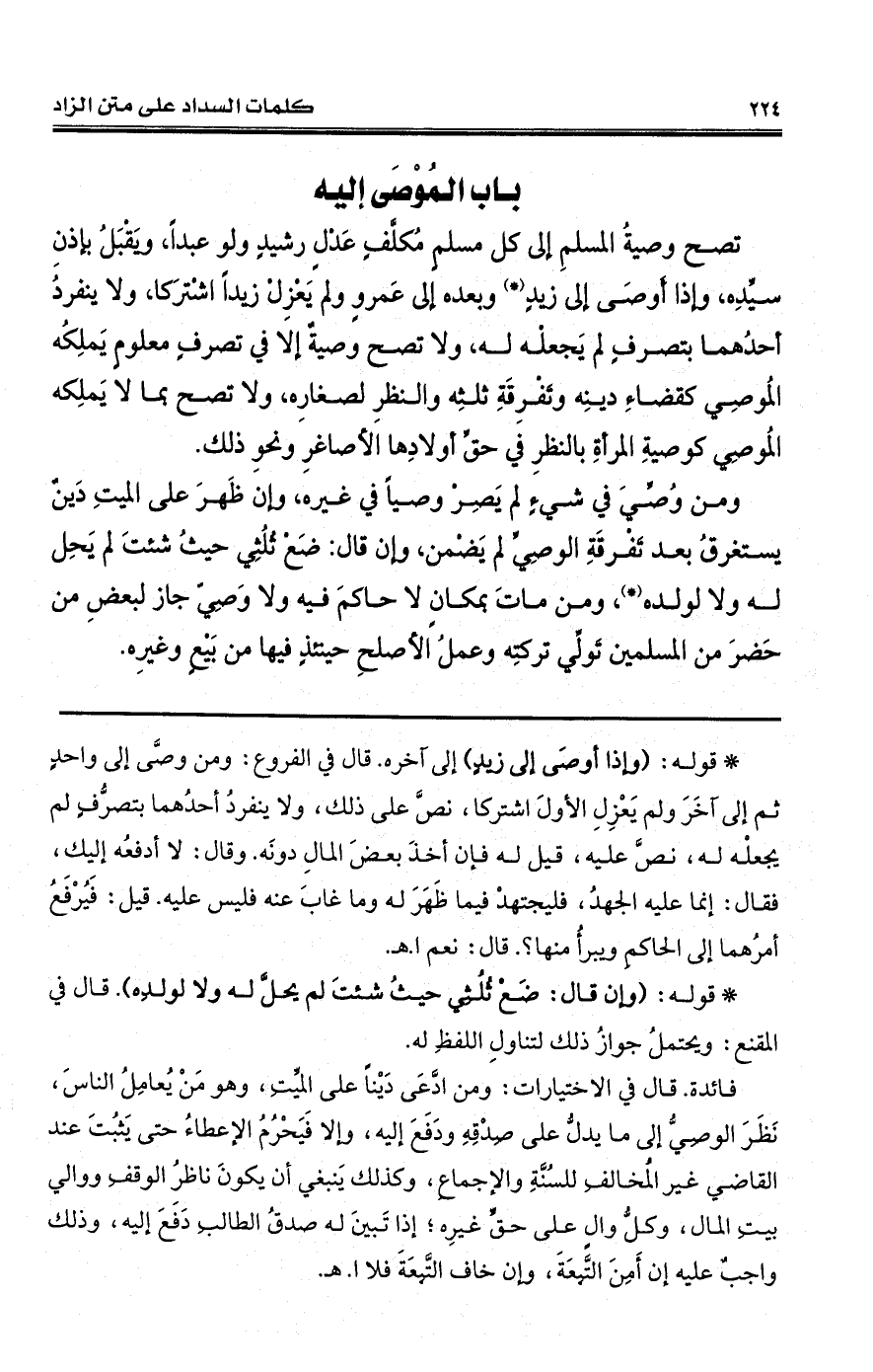 تصح وصيةُ المسلمِ إلى كل مسلمٍ مُكلَّفٍ عَدْلٍ رشيدٍ ولو عبداً، ويَقْبَلُ بإذنِ سيِّدِه، وإذا أَوصَى إلى زيدٍ (*) وبعده إلى عَمروٍ ولم يَعْزِلْ زيداً اشْترَكا، ولا ينفردُ أحدُهما بتصرفٍ لم يَجعلْه له، ولا تصح وصيةٌ إلا في تصرفٍ معلومٍ يَملِكُه المُوصِي كقضاءِ دينِه وتَفْرِقَةِ ثلثِه والنظرِ لصغارِه، ولا تصح بما لا يَملِكه المُوصِي كوصيةِ المرأةِ بالنظرِ في حقِّ أولادِها الأصاغرِ ونحوِ ذلك.