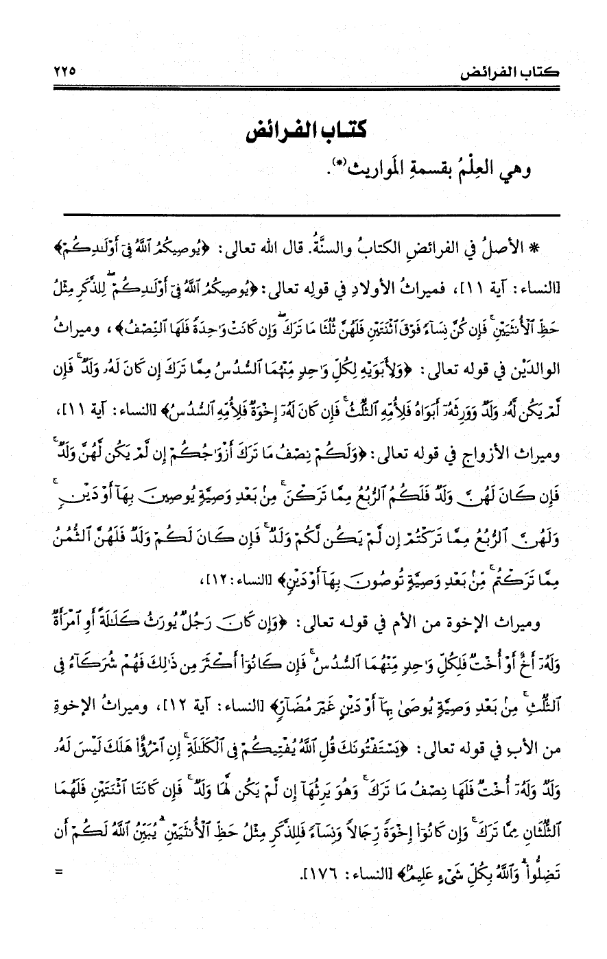 (*) الأصل في الفرائضِ الكتابُ والسنَّةُ. قال الله تعالى: {يُوصِيكُمُ اللَّهُ فِي أَوْلادِكُمْ} [النساء: آية 11]، فميراثُ الأولادِ في قولِه تعالى: {يُوصِيكُمُ اللَّهُ فِي أَوْلادِكُمْ لِلذَّكَرِ مِثْلُ حَظِّ الأنْثَيَيْنِ فَإِنْ كُنَّ نِسَاءً فَوْقَ اثْنَتَيْنِ فَلَهُنَّ ثُلُثَا مَا تَرَكَ وَإِنْ كَانَتْ وَاحِدَةً فَلَهَا النِّصْفُ}، وميراثُ الوالدَيْن في قوله تعالى: {وَلأبَوَيْهِ لِكُلِّ وَاحِدٍ مِنْهُمَا السُّدُسُ مِمَّا تَرَكَ إِنْ كَانَ لَهُ لَهُ وَلَدٌ فَإِنْ كَانَ لَهُ إِخْوَةٌ فَلأمِّهِ السُّدُسُ} [النساء: آية 11]، وميراث الأزواجِ في قوله تعالى: {وَلَكُمْ نِصْفُ مَا تَرَكَ أَزْوَاجُكُمْ إِنْ لَمْ يَكُنْ لَهُنَّ وَلَدٌ فَإِنْ كَانَ لَهُنَّ وَلَدٌ فَلَكُمُ الرُّبُعُ مِمَّا تَرَكْنَ مِنْ بَعْدِ وَصِيَّةٍ يُوصِينَ بِهَا أَوْ الرُّبُعُ مِمَّا تَرَكْتُمْ إِنْ لَمْ يَكُنْ لَكُمْ وَلَدٌ فَإِنْ كَانَ لَكُمْ وَلَدٌ مِمَّا تَرَكْتُمْ مِنْ بَعْدِ وَصِيَّةٍ تُوصُونَ بِهَا أَوْ دَيْنٍ} [النساء: 12]، وميراث الإخوة من الأم في قوله تعالى: {وَإِنْ كَانَ رَجُلٌ يُورَثُ كَلالَةً أَوِ امْرَأَةٌ وَلَهُ أَخٌ أَوْ أُخْتٌ فَلِكُلِّ وَاحِدٍ مِنْهُمَا السُّدُسُ فَإِنْ كَانُوا أَكْثَرَ مِنْ ذَلِكَ فَهُمْ شُرَكَاءُ فِي الثُّلُثِ مِنْ بَعْدِ وَصِيَّةٍ يُوصَى بِهَا أَوْ دَيْنٍ غَيْرَ مُضَارٍّ} [النساء: آية 12]،