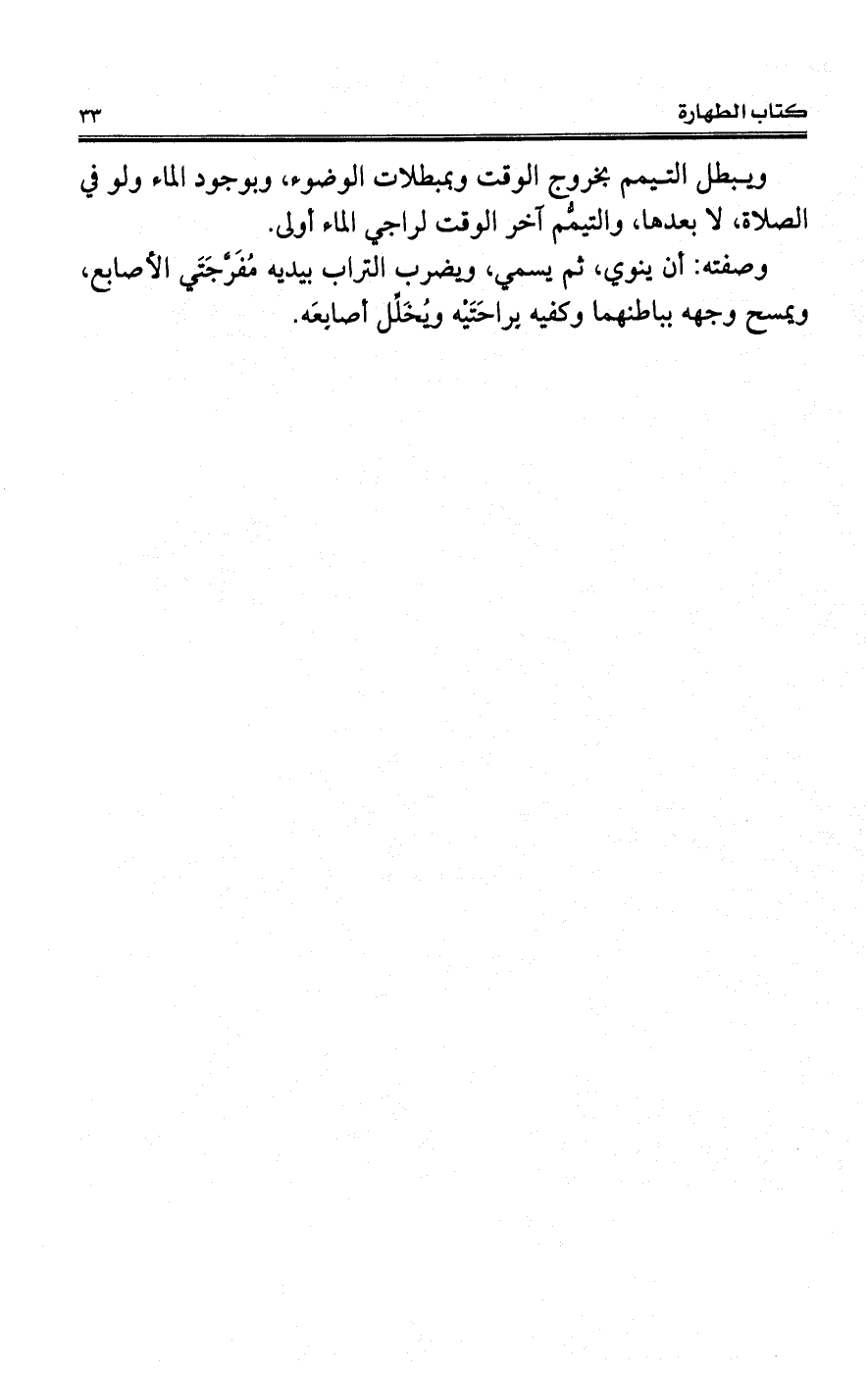وصفته: أن ينوي، ثم يسمي، ويضرب التراب بيديه مُفَرَّجَتَي الأصابع، ويمسح وجهه بباطنهما وكفيه بِراحَتَيْه ويُخَلِّل أصابِعَه.