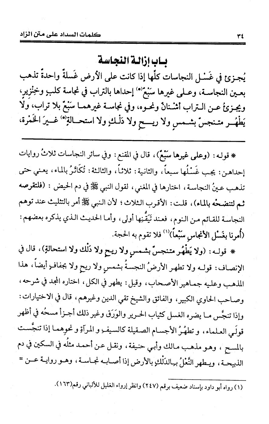 يُجزئ في غَسْل النجاسات كلِّها إذا كانت على الأرض غَسلةٌ واحدةٌ تذهب بعين النجاسة، وعلى غيرها سَبْعٌ (*) إحداها بالتراب في نجاسة كلبٍ وخِنْزِيرٍ، ويجزئُ عن التراب أشْنانٌ ونحوه، وفي نجاسة غيرهما سَبْعٌ بلا تراب، ولا يَطْهُر متنجسٌ بشمسٍ ولا ريحٍ ولا دَلْكٍ ولا استحالةٍ (*) غيرَ الخَمْرة،