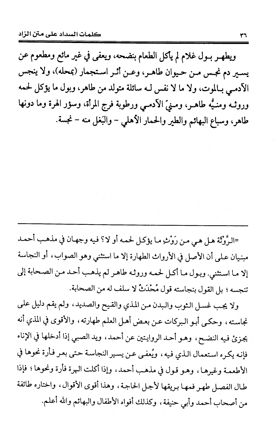ويطهر بول غلام لم يأكل الطعام بنضحه، ويعفى في غير مائع ومطعوم عن يسير دم نجس من حيوان طاهر، وعن أثر استجمار (بمحله)، ولا ينجس الآدمي بالموت، ولا ما لا نفس له سائلة متولد من طاهر، وبول ما يؤكل لحمه وروثه ومنيُّه طاهر، ومنيّ الآدمي ورطوبة فرج المرأة، وسؤر الهرة وما دونها طاهر، وسباع البهائم والطير والحمار الأهلي -والبَغل منه- نجسة.