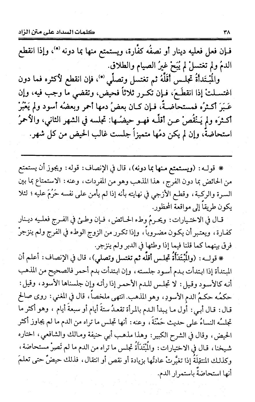 (*) قوله: (ويستمتع منها بما دونه)، قال في الإنصاف: قوله: ويجوز أن يستمتع هذا المذهب وهو من المفردات، وعنه: الاستمتاع بما بين السرة والركبة، وقطع الأزجي في نهايته بأنه إذا لم يأمن على نفسه حَرُمَ عليه؛ لئلا يكون طريقاً إلى مواقعة المحظور.