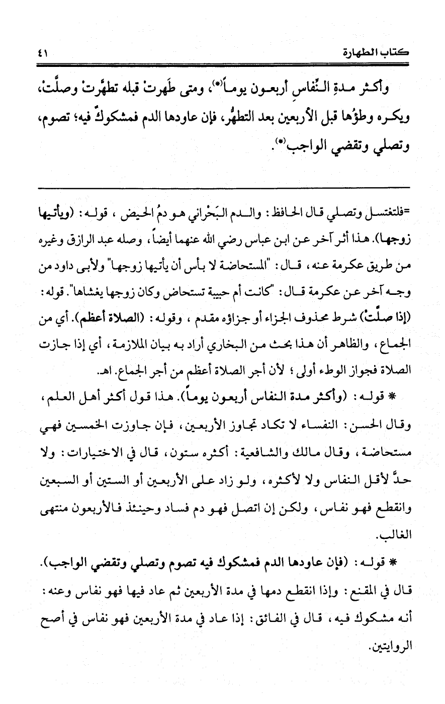 (*) قوله: (وأكثر مدة النفاس أربعون يوماً). هذا قول أكثر أهل العلم، وقال الحسن: النفساء لا تكاد تجاوز الأربعين، فإن جاوزت الخمسين فهي مستحاضة، وقال مالك والشافعية: أكثره ستون، قال في الاختيارات: ولا حدَّ لأقل النفاس ولا لأكثره، ولو زاد على الأربعين أو الستين أو السبعين وانقطع فهو نفاس، ولكن إن اتصل فهو دم فساد وحينئذ فالأربعون منتهى الغالب.