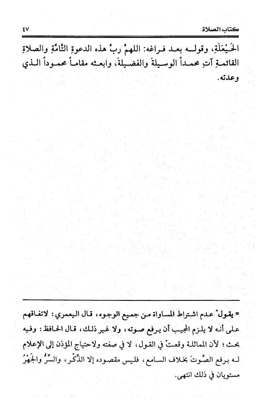 = يقول عدم اشتراط المساواة من جميع الوجوه، قال اليعمري: لاتفاقهم على أنه لا يلزم المجيب أن يرفع صوته، ولا غير ذلك، قال الحافظ: وفيه بحث؛ لأن المماثلة وقعتْ في القول، لا في صفته ولاحتياج المؤذن إلى الإعلام له برفع الصَّوتَ بخلاف السامع، فليس مقصوده إلا الذِّكْر، والسِّرُّ والجَهْرُ مستويان في ذلك انتهى.