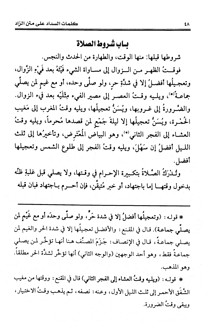 فوقتُ الظهر من الزوال إلى مساواة الشيء فَيْئَهُ بعد فَيْءِ الزَّوال، وتعجيلُها أفضلُ إلا في شدَّةِ حرٍ، ولو صلَّى وحده، أو مع غيمٍ لمن يصلِّي جماعةً (*)، ويليه وقتُ العصر إلى مصير الفيء مِثْلَيْه بعد فيء الزوال. والضَّرورةُ إلى غروبها، ويُسَنُّ تعجيلُها، ويليه وقتُ المغرب إلى مَغيب الحُمْرة، ويُسَنُّ تعجيلُها إلا ليلةَ جَمْعٍ لمن قصدها مُحرماً، ويليه وقتُ العشاء إلى الفجر الثاني (*) وهو البياض المُعْتَرِض، وتأخيرُها إلى ثلث الليل أفضلُ إن سَهُلَ، ويليه وقتُ الفجر إلى طلوع الشمس وتعجيلها أفضل.