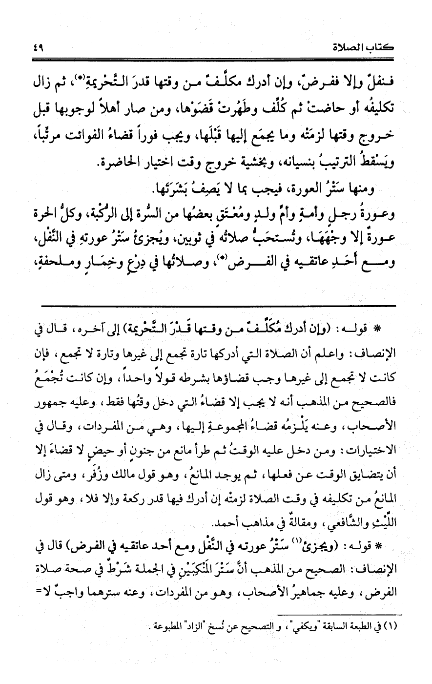 وعورةُ رجلٍ وأمةٍ وأمِّ ولدٍ ومُعْتَقٍ بعضُها من السُّرة إلى الرُّكْبة، وكلُّ الحرة عورةٌ إلا في ثوبين، ويُجزئُ سَتْرُ عورتهِ في النَّفْل، ومع أَحَدِ عاتقيه في الفرض (*)، وصلاتُها في دِرْعٍ وخِمَارٍ وملحفةٍ،