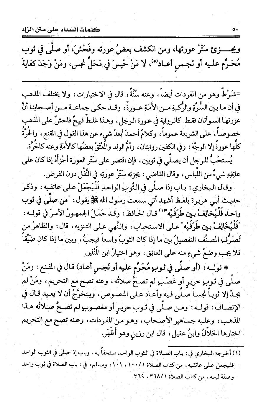 وقال البخاري: باب إذا صلَّى في الثَّوبِ الواحدِ فَلْيَجْعَلْ على عاتقيه، وذكر حديث أبي هريرة بلفظ أشهد أني سمعت رسول الله - صلى الله عليه وسلم - يقول: "من صلَّى في ثوب واحد فَلْيُخالِفْ بين طَرَفَيْه" (¬1) قال الحافظ: وقد حَمَلَ الجمهورُ الأمرَ في قوله: "فَلْيُخَالِفْ بين طَرَفَيْه" على الاستحباب، والنَّهي على التنزيه، قال: والظاهرُ من تَصَرُّفِ المصنِّف التفصيلُ بين ما إذا كان الثوبُ واسعاً فيجبُ، وبين ما إذا كان ضَيِّقاً فلا يجب وضعُ شيءٍ منه على العاتِق، وهو اختيارُ ابن المُنْذِر.