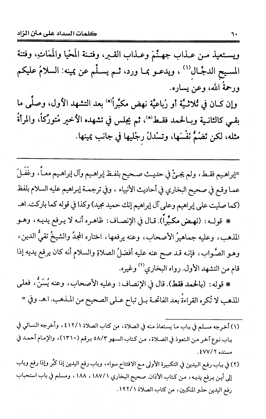 (*) قوله: (نهض مكبِّرًا). قال في الإنصاف: ظاهره أنه لا يرفع يديه، وهو المذهب، وعليه جماهيرُ الأصحاب، وعنه يرفعها، اختاره المجدُ والشيخُ تقيُّ الدين، وهو الصَّواب، فإنه قد صح عنه عليه أفضلُ الصلاةِ والسلامِ أنه كان يرفع يديه إذا قام من التشهد الأول. رواه البخاري (¬2) وغيره.