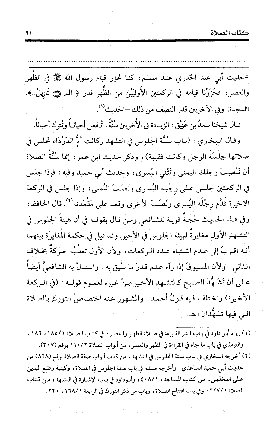 (¬2) أخرجه البخاري في باب سنة في التشهد، من كتاب أبواب صفة الصلاة برقم (828) من حديث أبي حميد الساعدي، وأخرجه مسلم في باب صفة الجلوس في الصلاة، وكيفية وضع اليدين على الفخذين، من كتاب المساجد، 1/ 408، وأبوداود في باب الإشارة في التشهد، من كتاب الصلاة 1/ 227، وفي باب افتتاح الصلاة، وباب من ذكر التورك في الرابعة 1/ 168، 220.