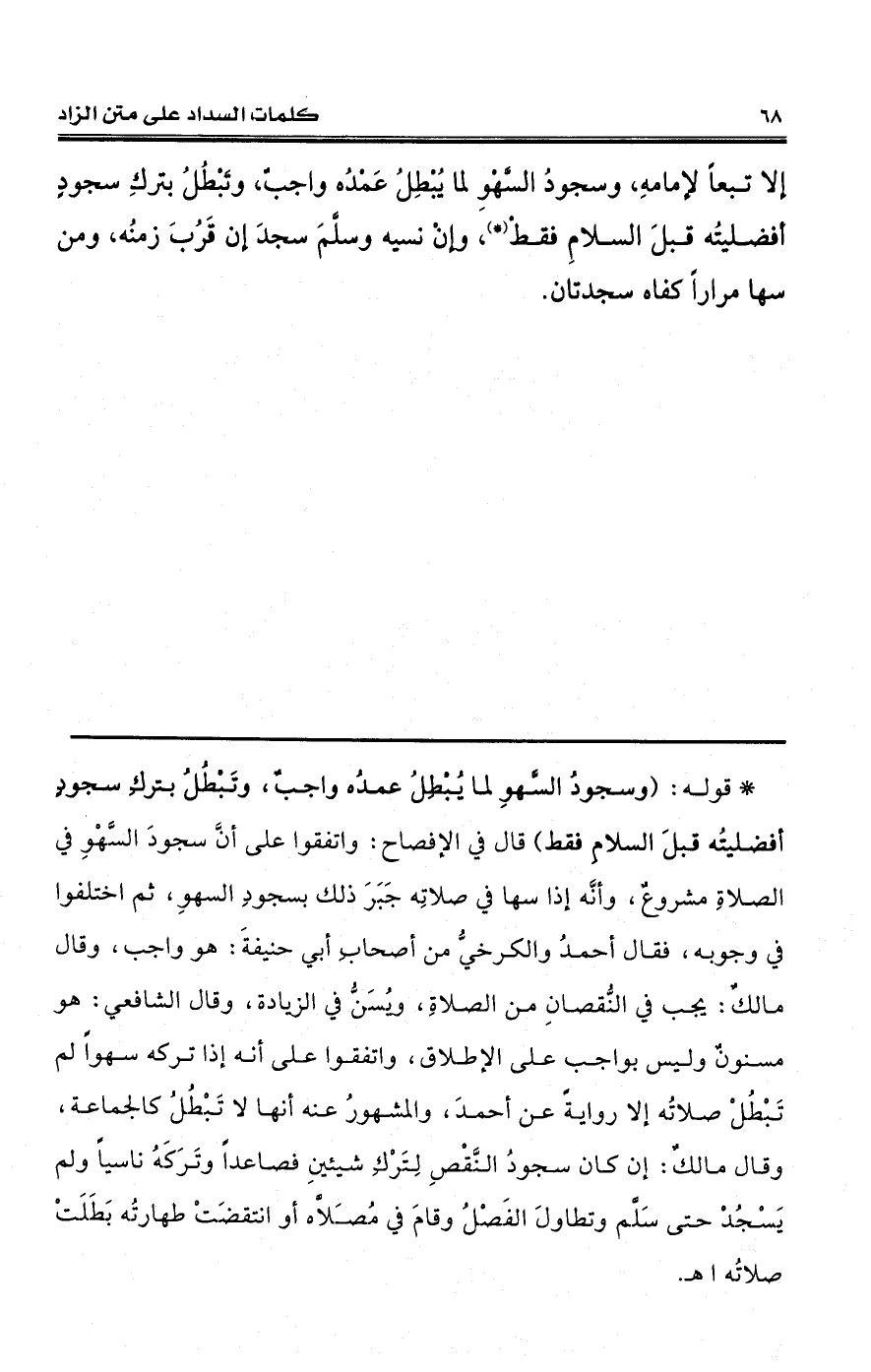 (*) قوله: (وسجودُ السَّهوِ لما يُبْطِلُ عمدُه واجبٌ، وتَبْطُلُ بتركِ سجودٍ أفضليتُه قبلَ السلامٍ فقط) قال في الإفصاح: واتفقوا على أنَّ سجودَ السَّهْوِ في الصلاةِ مشروعٌ، وأنَّه إذا سها في صلاتِه جَبَرَ ذلك بسجودِ السهوِ، ثم اختلفوا في وجوبه، فقال أحمدُ والكرخيُّ من أصحابِ أبي حنيفةَ: هو واجب، وقال مالكٌ: يجب في النُّقصانِ من الصلاةِ، ويُسَنُّ في الزيادة، وقال الشافعي: هو مسنونٌ وليس بواجب على الإطلاق، واتفقوا على أنه إذا تركه سهواً لم تَبْطُلْ صلاتُه إلا روايةً عن أحمدَ، والمشهورُ عنه أنها لا تَبْطُلُ كالجماعة، وقال مالكٌ: إن كان سجودُ النَّقْصِ لِتَرْكِ شيئينِ فصاعدًا وتَرَكَهُ ناسياً ولم يَسْجُدْ حتى سَلَّم وتطاولَ الفَصْلُ وقامَ في مُصَلاَّه أو انتقضَتْ طهارتُه بَطَلَتْ صلاتُه اهـ.