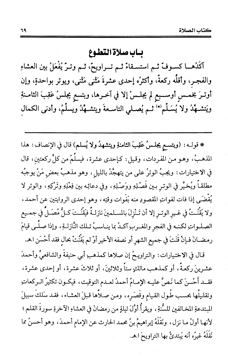 (*) قوله: (وبتسعٍ يجلسُ عَقِبَ الثامنةِ ويتشهدُ ولا يُسلم) قال في الإنصاف: هذا المذهبُ، وهو من المفردات، وقيل: كإحدى عشرة، فيسلِّمُ من كلِّ ركعتينِ، قال في الاختيارات: ويجبُ الوترُ على من يتهجَّدُ بالليلِ، وهو مذهبُ بعضِ مَنْ يوجبُه مطلقاً ويُخيَّر في الوترِ بين فَصْلِهِ ووَصْلِهِ، وفي دعائِه بين فِعْلِهِ وتَرْكِهِ، والوتر لا يُقْضَى إذا فات لفواتِ المقصودِ منه بَفَوات وقتِه، وهو إحدى الروايتين عن أحمد، ولا يَقْنُتُ في غيرِ الوترِ إلا أن تَنْزِلَ بالمسلمينَ نازلةٌ فيَقْنُتَ كلُّ مُصَلٍّ في جميعِ الصلواتِ لكنه في الفجرِ والمغربِ آكدُ بما يناسبُ تلك النَّازلةِ، وإذا صلَّى قيامَ رمضانَ فإنْ قَنَتَ في جميعِ الشهرِ أو نصفه الأخير أوْ لم يَقْنُتْ بحالٍ فقد أَحْسَن ا. هـ.