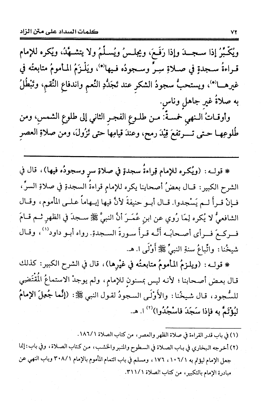 ويُكّبِّرُ إذا سجدَ وإذا رَفَعَ، ويجلسُ ويُسلِّمُ ولا يتشهَّدُ، ويُكره للإمام قراءةُ سجدةٍ في صلاةِ سِرٍّ وسجودُه فيها (*)، ويَلْزَمُ المأمومُ متابعتُه في غيرها (*)، ويستحبُّ سجودُ الشكرِ عند تَجَدُّدِ النِّعمِ واندفاعِ النِّقمِ، وتَبْطُلُ به صلاةُ غيرِ جاهلٍ وناسٍ.