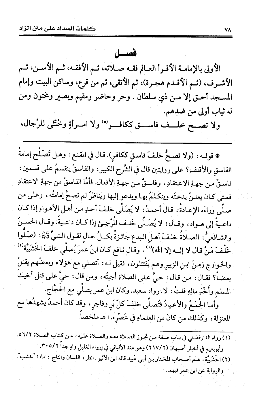 (*) قوله: (ولا تصحُّ خلفَ فاسقٍ ككافرٍ). قال في المقنع: وهل تَصْلُح إمامةُ في الشَّرح الكبير: والفاسقُ ينقسمُ على قسمين: فاسقٌ من جهةِ الاعتقادِ، وفاسقٌ من جهةِ الأفعال. فأمَّا الفاسقُ من جهةِ الاعتقادِ فمتى كان يعلن بِدعتَه ويتكلمُ بها ويدعو إليها ويناظرُ لم تصحَّ إمامتُه، وعلى قال أحمدُ: لا يُصَلَّى خلفَ أحدٍ من أهل الأهواءِ إذا كان داعيةً إلى هواه، وقال: لا يُصَلَّى خَلف المُرْجِئ إذا كان داعيةً. وقال الحسنُ والشافعيُّ: الصلاةُ خلفَ أهلِ البدعِ جائزةٌ بكلِّ حالٍ لقول النبيِّ - صلى الله عليه وسلم -: (صَلُّوا خَلْفَ مَنْ قال لا إله إلا الله) (¬1)، وقال نافع كان ابنُ عمرَ يُصلِّي خلفَ الخَشَبِيَّة (¬2) والخوارج زمنَ ابنِ الزبيرِ وهم يَقْتتلون، فقيل له: أتصلي مع هؤلاء وبعضُهم يقتلُ بعضاً؟ فقال: من قال: حيَّ على الصلاةِ أجبتُه، ومن قال: حيَّ على قتل أخيكَ المسلمِ وأَخْذِ مالِهِ قلتُ: لا. رواه سعيد. وكان ابنُ عمر يصلِّي مع الحَجَّاج.