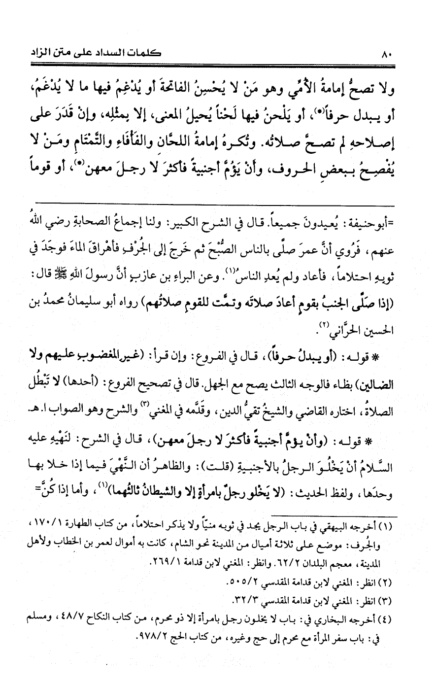 ولا تصحُّ إمامةُ الأُمِّي وهو مَنْ لا يُحْسِنُ الفاتحةَ أو يُدْغِمُ فيها ما لا يُدْغَمُ، أو يبدل حرفاً (*)، أو يَلْحنُ فيها لَحْناً يُحيلُ إلا بِمثْلِه، وإنْ قَدَرَ على إصلاحهِ لم تصحَّ صلاتُه. وتُكرهُ إمامةُ اللحَّانِ والفَأْفَاءِ والتَّمْتَامِ ومَنْ لا يُفْصِحُ ببعضِ الحروف، وأَنْ يَؤُمَّ أجنبيةً فأكثرَ لَا رجلَ معهن (*)، أو قوماً
