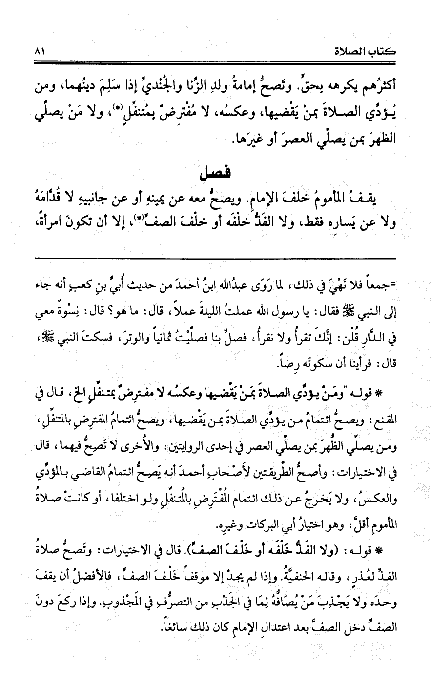 يقفُ المأمومُ خلفَ الإمامِ. ويصحُّ معه عن يمينهِ أو عن جانبيهِ لا قُدَّامَهُ ولا عن يَسارِه فقط، ولا الفَذُّ خلْفَه أو خلْفَ الصفِّ (*)، إلا أن تكونَ امرأةً،