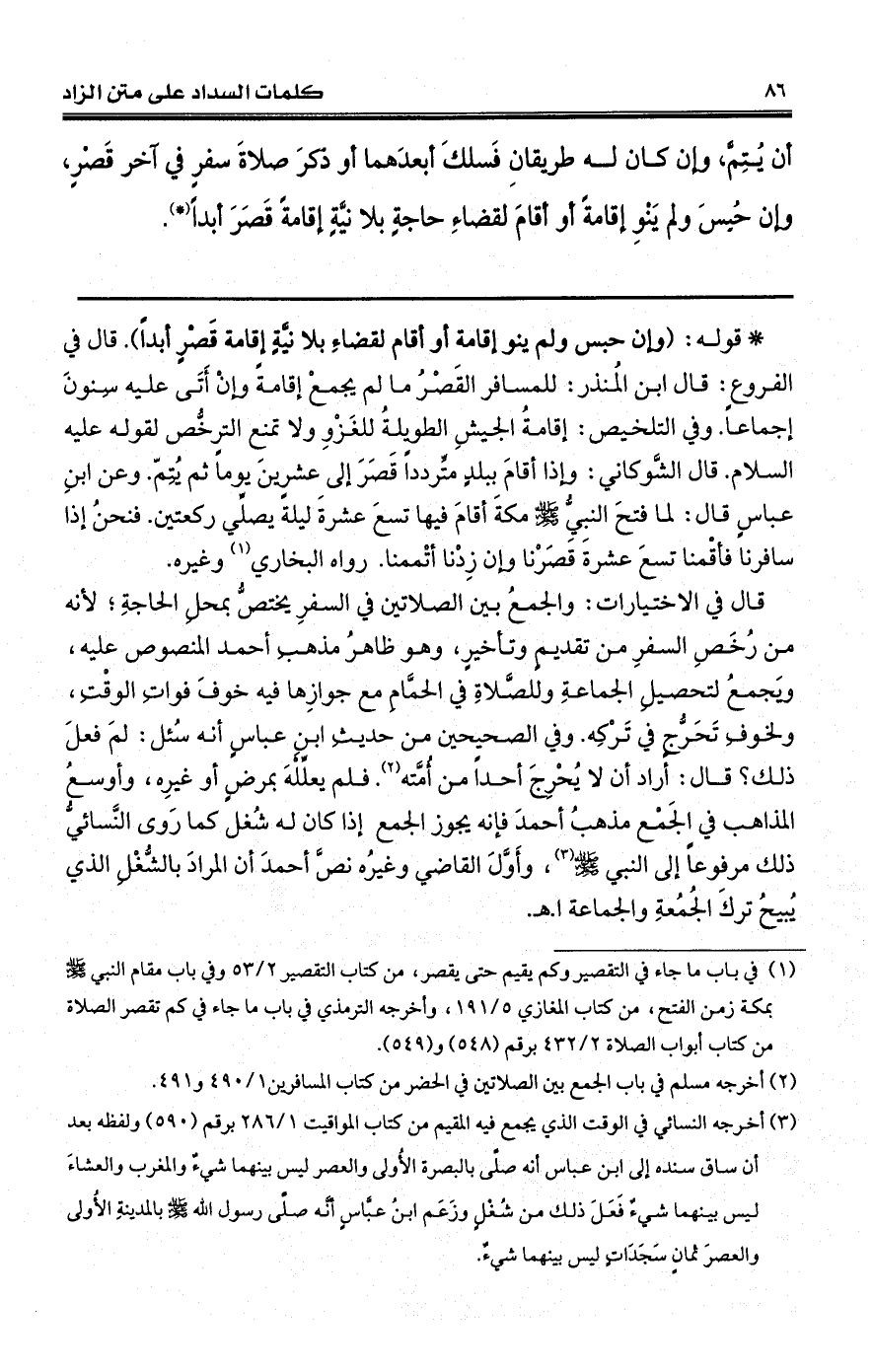 (*) قوله: (وإن حبس ولم ينو إقامة أو أقام لقضاءِ بلا نيَّةٍ إقامة قَصْرٍ أبداً). قال في الفروع: قال ابن المُنذر: للمسافر القَصْرُ ما لم يجمعْ إقامةً وإنْ أَتَى عليه سِنونَ إجماعاً. وفي التلخيص: إقامةُ الجيشِ الطويلةُ للغَزْوِ ولا تمنع الترخُّص لقوله عليه السلام. قال الشَّوكاني: وإذا أقامَ ببلدٍ متِّردداً قَصَرَ إلى عشرينَ يوماً ثم يُتِمّ. وعن ابنِ عباسٍ قال: لما فتحَ النبيُّ - صلى الله عليه وسلم - مكةَ أقامَ فيها تسعَ عشرةَ ليلةً يصلِّي ركعتين. فنحنُ إذا سافرنا فأقْمنا تسعَ عشرةَ قَصَرْنا وإن زِدْنا أتْممنا. رواه البخاري (¬1) وغيره.