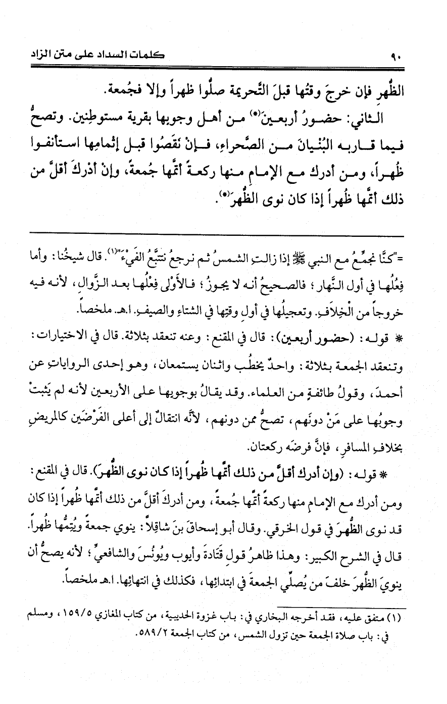 (*) قوله: (وإن أدرك أقلَّ من ذلك أتمَّها ظُهراً إذا كان نوى الظُّهرَ). قال في المقنع: ومن أدرك مع الإمامِ منها ركعةً أتمَّها جُمعةً، ومن أدركَ ذلك أتمَّها ظُهراً إذا كان قد نوى الظُّهرَ في قول الخرقي. وقال أبو إسحاقَ بنَ شاقِلاَّ: ينوي جمعةً ويُتِمُّها ظُهراً. قال في الشرح الكبير: وهذا ظاهرُ قولِ قَتَادةَ وأيوب ويُونُسَ والشافعيِّ؛ لأنه يصحُّ أن ينويَ الظُّهرَ خلفَ من يُصلِّي الجمعةَ في ابتدائِها، فكذلك في انتهائِها. ا. هـ ملخصاً.