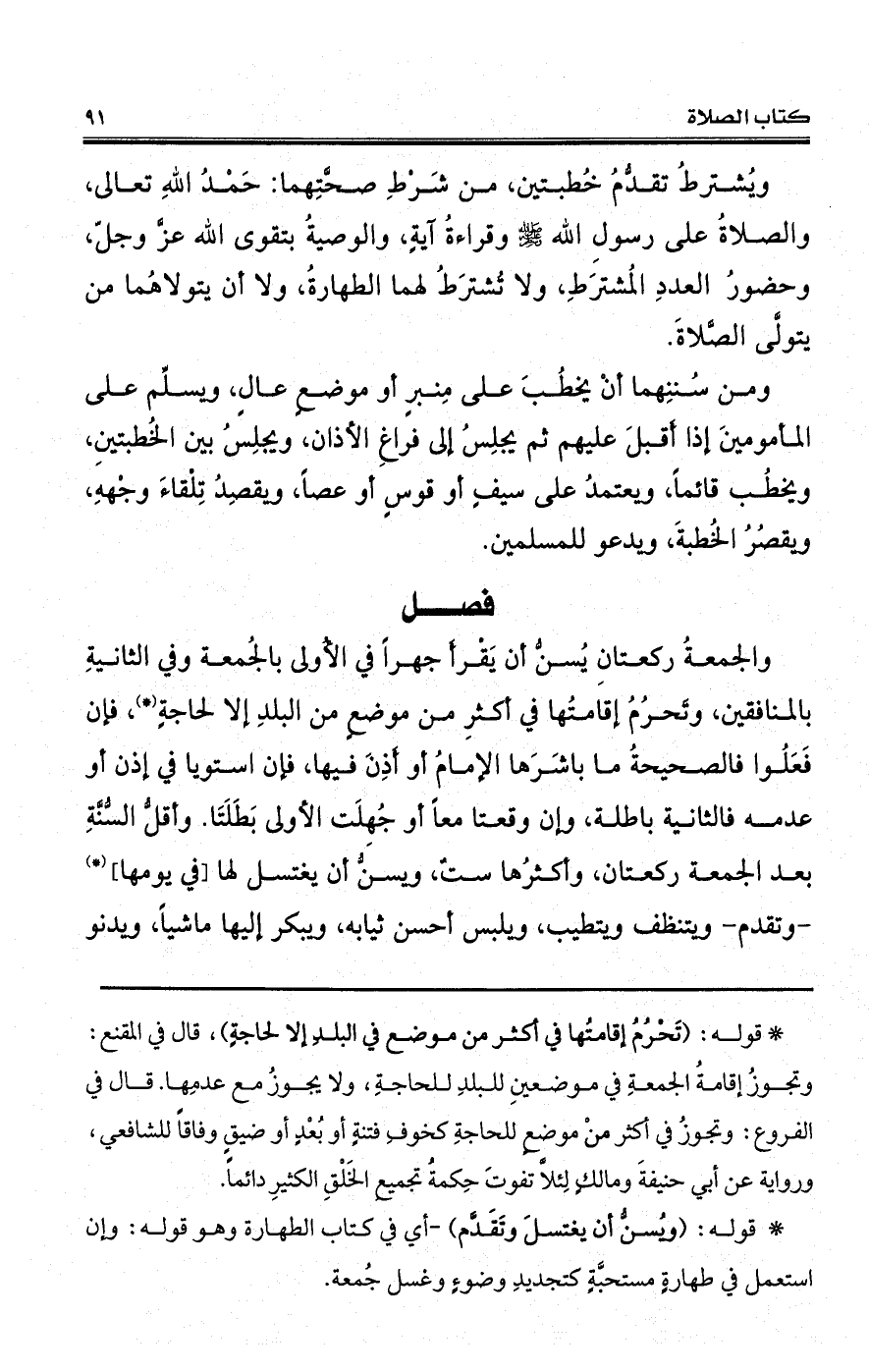 والجمعةُ ركعتانِ يُسنُّ أن يقرأ جهرا في الأُولى بالجُمعة وفي في أكثرِ من موضعٍ من البلدِ إلا لحاجةٍ (*)، فإن فَعَلُوا فالصحيحةُ ما باشَرَها الإمامُ أو أَذِنَ فيها، فإن استويا في إذن أو عدمه فالثانية باطلة، وإن وقعتا معاً أو جُهِلَت الأولى بَطَلَتَا. وأقلُّ السُّنَّةِ بعد الجمعة ركعتان، وأكثرُها ستٌ، ويسنُّ أن يغتسل لها [في يومها] (*) -وتقدم- ويتنظف ويتطيب، ويلبس أحسن ثيابه، ويبكر إليها ماشياً، ويدنو