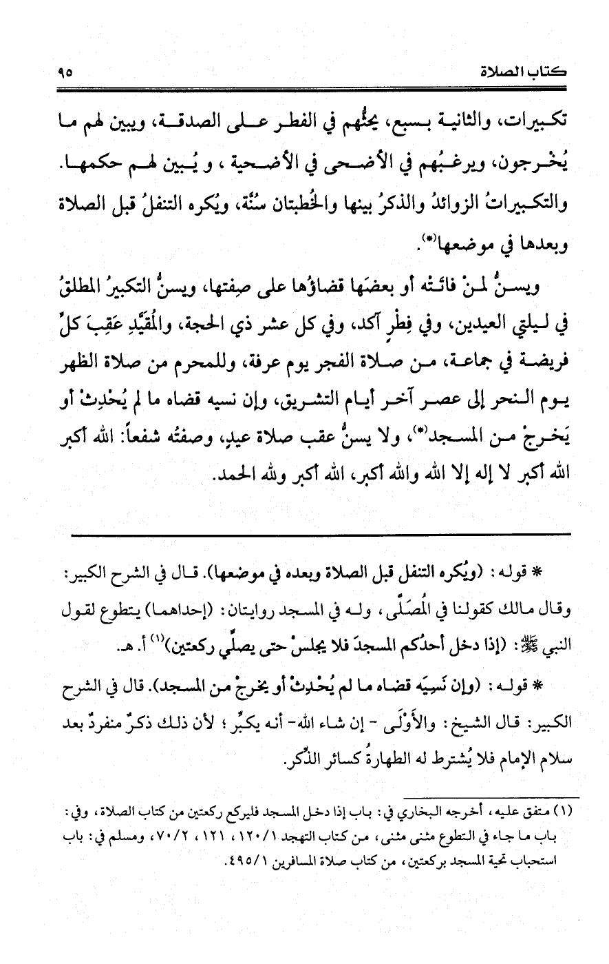 (*) قوله: (ويُكره التنفل قبل الصلاة وبعده في موضعها). قال في الشرح الكبير: وقال مالك كقولنا في المُصَلَّى، وله في المسجد روايتان: (إحداهما) يتطوع لقول النبي - صلى الله عليه وسلم -: (إذا دخل أحدُكم المسجدَ فلا يجلسْ حتى يصلِّي ركعتين) (¬1) أ. هـ.