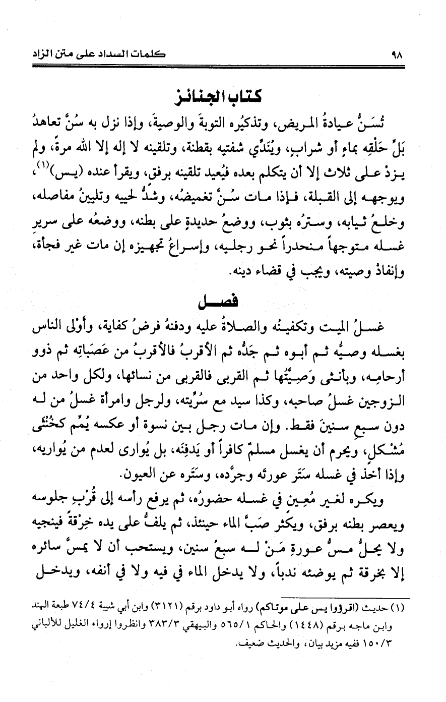 تُسَنُّ عيادةُ المريض، وتذكيُره التوبةَ والوصيةَ، وإذا نزل به سُنَّ تعاهدُ بَلِّ حَلْقِه بماءٍ أو شرابٍ، ويُنَدِّي شفتيه بقطنة، وتلقينه لا إله إلا الله مرةً، ولم يزدْ على ثلاث إلا أن يتكلم بعده فيُعيد تلقينه برفقٍ، ويقرأ عنده (يس) (¬1)، ويوجهه إلى القبلة، فإذا مات سُنَّ تغميضُه، وشدُّ لحييه وتليينُ مفاصله، وخلعُ ثيابه، وسترُه بثوب، ووضعُ حديدةٍ على بطنه، ووضعُه على سريرِ غسله متوجهاً منحدراً نحو رجليه، وإسراعُ تجهيزه إن مات غير فجأة، وإنفاذُ وصيته، ويجب في قضاء دينه.