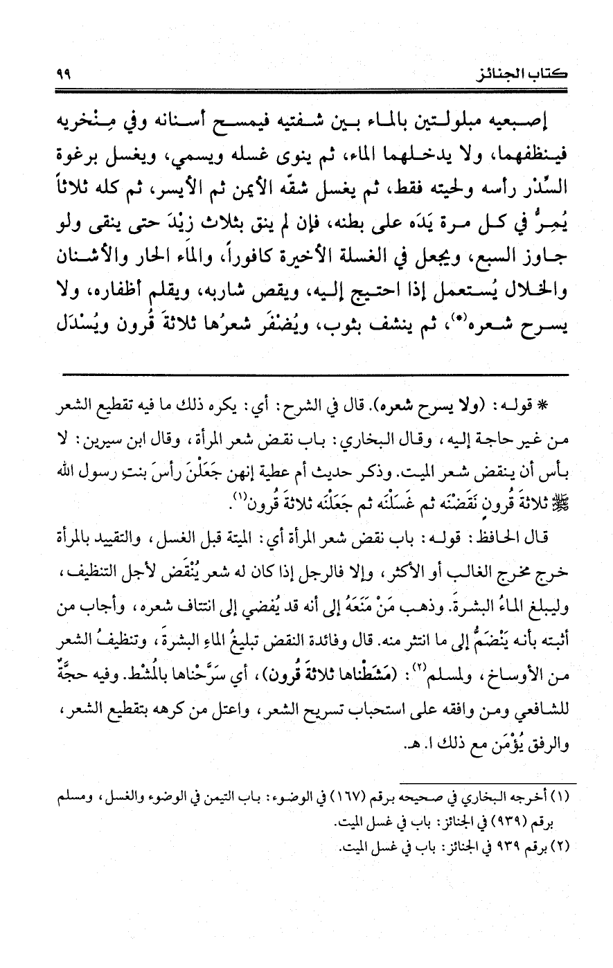(*) قوله: (ولا يسرح شعره). قال في الشرح: أي: يكره ذلك ما فيه تقطيع الشعر من غير حاجة إليه، وقال البخاري: باب نقض شعر المرأة، وقال ابن سيرين: لا بأس أن ينقض شعر الميت. وذكر حديث أم عطية إنهن جَعَلْنَ رأسَ بنتِ رسول الله - صلى الله عليه وسلم - ثلاثةَ قُرونٍ نَقَضْنَه ثم غَسَلْنَه ثم جَعَلْنَه ثلاثةَ قُرون (¬1).