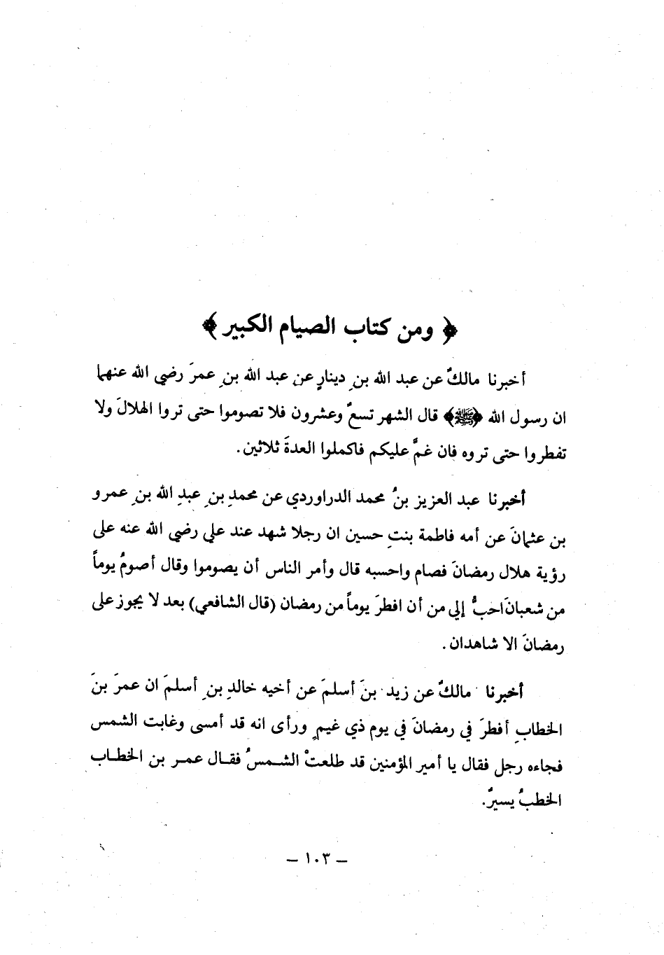 أَخْبَرَنَا مَالِكٌ، عَنْ عَبْدِ اللَّهِ بْنِ دِينَارٍ، عَنْ عَبْدِ اللَّهِ بْنِ عُمَرَ رَضِيَ اللَّهُ عَنْهُمَا أَنَّ رَسُولَ اللَّهِ صَلَّى اللهُ عَلَيْهِ وَسَلَّمَ قَالَ: «§الشَّهْرُ تِسْعٌ وَعِشْرُونَ، فَلَا تَصُومُوا حَتَّى تَرَوُا الْهِلَالَ، وَلَا تُفْطِرُوا حَتَّى تَرَوْهُ، فَإِنْ غُمَّ عَلَيْكُمْ فَأَكْمِلُوا الْعِدَّةَ ثَلَاثِينَ»